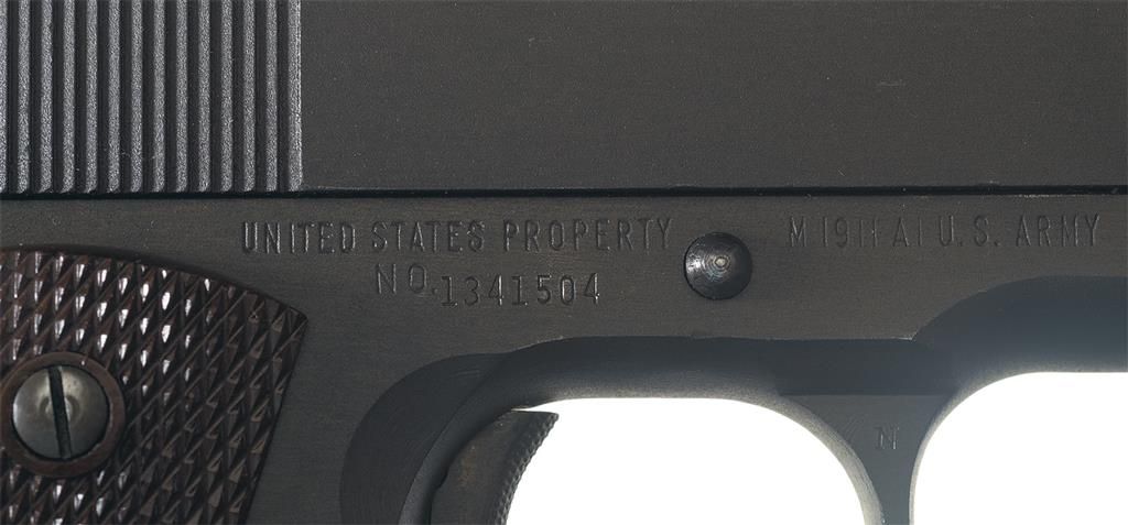 Made in 1943. Fixed sights, with desirable second pattern slide markings of: "REMINGTON RAND INC./SYRACUSE, N.Y. U.S.A." with the "P" on top. It has the "FJA" Frank J. Atwood inspected frame with "NO." style serial number marking, stamped trigger, thin hammer, serrated mainspring housing and slide catch, and Keyes Fiber grips. Included with the pistol is a brown cardboard collector's box.