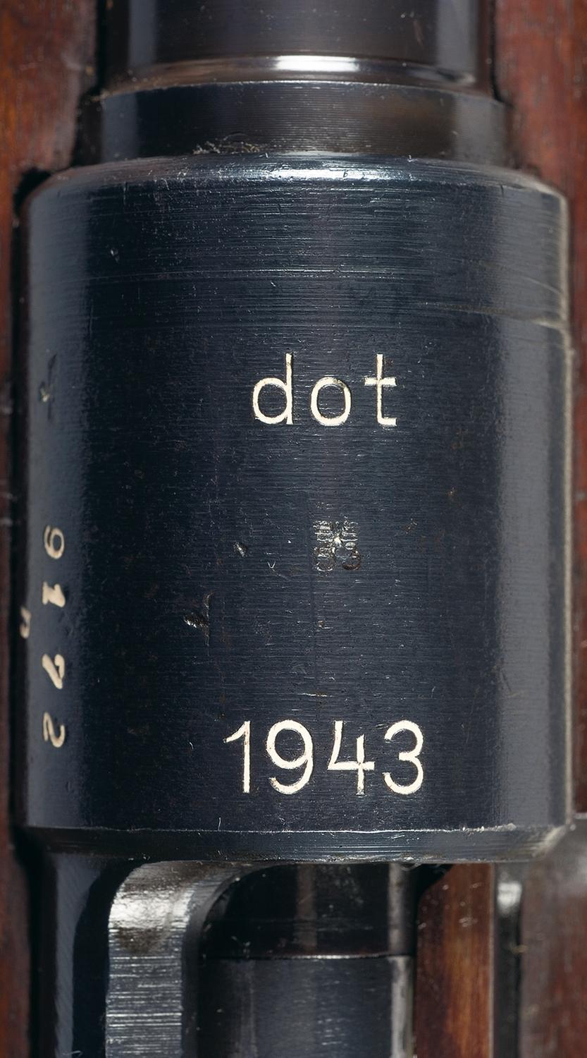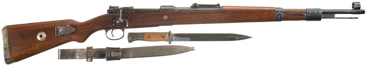 Produced in 1943 in Czechoslovakia. Blade and tangent sights, with the makers mark and date on the receiver ring and "Mod 98" on the sidewall. Matching numbers with stamped and welded components. Smooth stock with "dot" stamped on the handguard and underside and a cupped buttplate. With a brown leather sling and a "clc43" (Herder, Solingen) bayonet with 10" blade, smooth grips, matching numbered sheath and leather frog.
