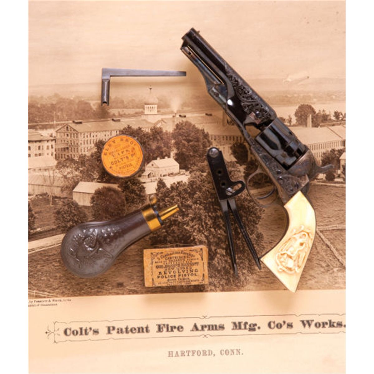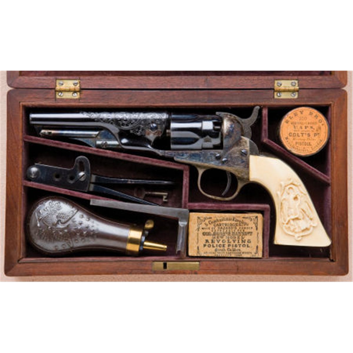Exceptional and Fine Cased, Engraved and Carved Ivory-Gripped Colt Model 1862 Police Model Revolver Serial number 37951/E. .36 caliber, 5-shot semi-fluted and rebated cylinder. 4 1/2-inch round barrel with brass pin front sight. Top of barrel stamped with single line Address Col. Saml. Colt New-York U.S. America.Left side of frame engraved "Colts/Patent." Scroll and border engraved in late vine style engraving, with coverage on the barrel, frame, hammer, and gripstraps. Backstrap engraving of the Gustave Young scroll style. Wolf head motif on each side of hammer. Finely knurled hammer spur. Blued, with casehardened frame, hammer, and loading lever, with silver-plated brass gripstraps. The grips of relief-carved ivory, the left side with Mexican eagle motif within exaggerated snake border.Varnished mahogany case, lined in burgundy velvet. Embossed American eagle and shield powder flask, blued steel best quality double cavity bullet mold with finely formed handles, rich blue and 36P marking on one arm. Additional accessories of tin of Eley Bros. percussion caps with orange paper label, blued L-shaped screwdriver/nipple wrench, two packets of combustible envelope cartridges by Colt's Cartridge Works, and key. Wood key plate inlaid on front of case.Accompanied by manila folder containing documenting letter on this set by R.L. Wilson. Plus catalogue sheet, with color photograph of the revolver; the sheet noting all contents of the set and various other details. Also included, two photocopies and an original of a letter from Herb Glass, Jr., to Neil S. Berman, dated November 1, 1989, documenting serial no. 37951/E cased Colt Model 1862 Police revolver. Information includes the statement: "My father obtained [the set] from Mrs. William Locke in 1977, 4 years after William Locke's death. It was in the Richard Mellon collection until 1980, when my father re-acquired it in a trade. He kept it until 1986. . . . He always admired this particular set because of the lovely extra polish blue finish and the superb, high relief carved Mexican Eagle ivory grips." Also in the folder, an envelope addressed to Al Cali, from American Antiques of 1359 Broadway, New York, within which is the original of the Herb Glass, Jr., letter. Attribution of the engraving on this revolver is to Conrad F. Ulrich.Literature:R.L. Wilson. American Arms Collectors Percussion Colts and Their Rivals The Al Cali Collection, pages 74-75.Provenance:William M. LockeRichard Prosser MellonGreg MartinNeil BermanAl Cali