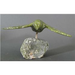 - light green stone carving by Kootoo Shaa (Lake Harbor), 1992, signed in syllabics and dated Wing span length: 7.5 in.