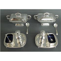 - includes two silver pepper shakers, two salt dishes (glass lined), one mustard dish (glass lined), two sauce dishes and matching tray. Sheffield Pla