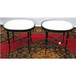 -with removable Wedgewood charger tray tops, circa 1810, black & gilt turned legs, joined by cross stretchers.