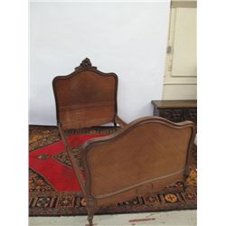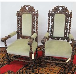 -with elaborate heavy carving featuring extensive barley twist members, and green upholstery.
