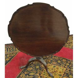 -mahogany with carved pie crust shaped top and heavily carved tripod legged base. 19th Century.