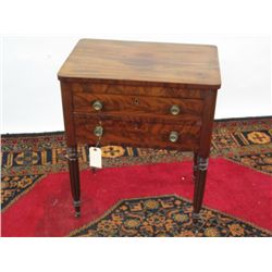 -inlaid drop front enclosing fitted interior and tooled leather writing surface.