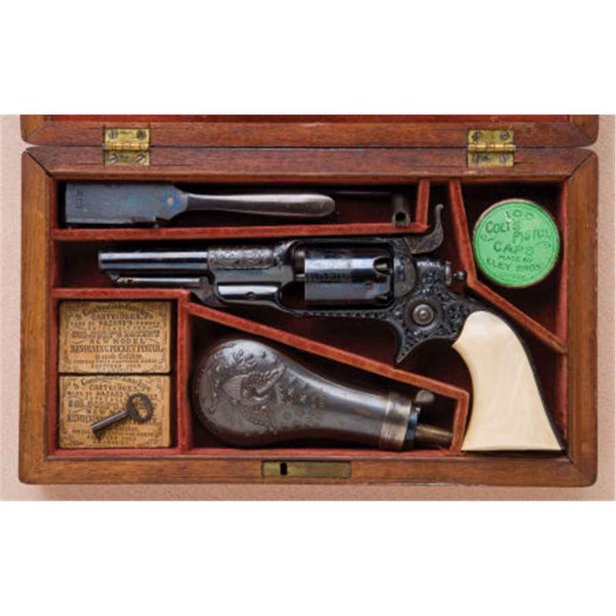 Exceptional and Important Historic Cased, Engraved and Inscribed Colt Model 1855 Pocket Model Sidehammer Revolver, Variation with Screw in Cylinder, Presented by the Colt Company to N.H. Gillett Serial number 11224 IE. .31 caliber, 5-shot cylinder with stagecoach holdup roll scene. 3 1/2-inch round barrel with brass pin front sight. Top of barrel stamped "Address Col. Colt/New-York U.S.A."Engraved in late vine style on the barrel, frame and hammer, the IE in the marking indicating "ivory, engraved." The backstrap presentation inscription to N.H. Gillett was executed in elegant script. Richly blued, with case-hardened hammer, and loading lever. The grips of single piece ivory.Documented in the Colt factory ledgers, the ledger states the following, in Journal B, page 430:Saturday January 12, 1867354. 220. Presentation a/c Dr. To MerchandiseFor 1 NM Pkt Pistol 3 1/2 in.Engd Ivory with all AppendagesIn Mahogany Case, presented toN.H. Gillette [$]20/53Accessories of a varnished mahogany case, lined in burgundy velvet. Embossed eagle and shield powder flask, blued steel double cavity bullet mold marked "31PKT" on one arm, tin of Eley Bros. percussion caps with green paper label, two packets of Colt's Cartridge Works combustible envelope cartridges, blued L-shaped screwdriver and key. Accompanied by receipt from A.L. Ulrich, former Colt Secretary and the firm's Museum Curator for many years, showing that he had purchased this revolver for $10.00, on December 23, 1939, Hartford, Connecticut. The seller was a James H. Taylor.Illustrated in The Colt Engraving Book, volume I, page 258, as well as in Colt Engraving, page 166.Reverend N.H. Gillett served for nearly twenty years as minister of the Unity Presbyterian Church, Latrobe, Pennsylvania, until his death in 1868. Gillett's church was one of the oldest of that denomination in the United States. Although the inspiration for the presentation cased set is presently unknown, Gillett is believed to have been known to both General William B. Franklin, Colt's General Manager and Vice President from 1865 to 1888, Richard W.H. Jarvis, Samuel Colt's brother-in-law, and president of the company from 1865 until 1901.The screw in cylinder variation is one of the most desirable of any from the New Pocket Revolver series, introduced c. 1855 in the new Colt Armory, Hartford. This revolver is not only historic, and rare, but in remarkable condition, never having been fired. Extensive research would establish further relevant information on Reverend Gillett, as well as on the rarity of this model, engraved and cased.Attribution of the engraving on this revolver is to Conrad F. Ulrich.Literature: American Arms Collectors Percussion Colts and Their Rivals The Al Cali Collection, pages 58-59.Provenance:Arthur L. UlrichAl Cali