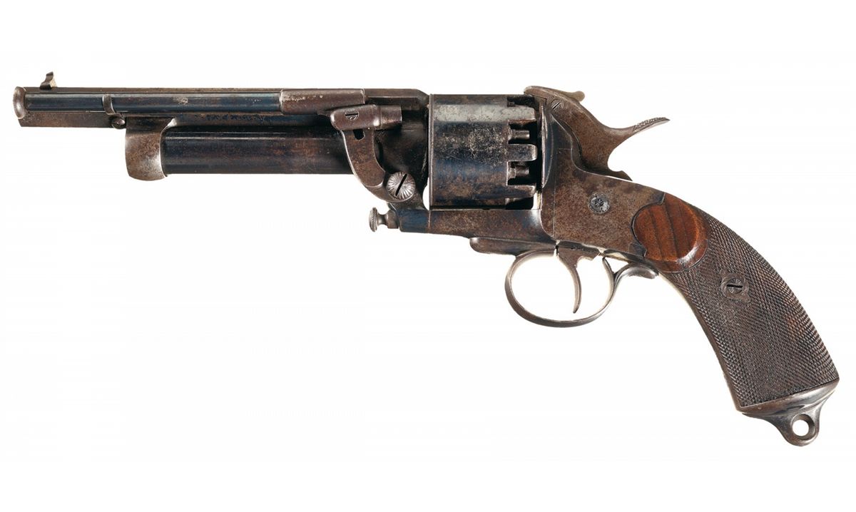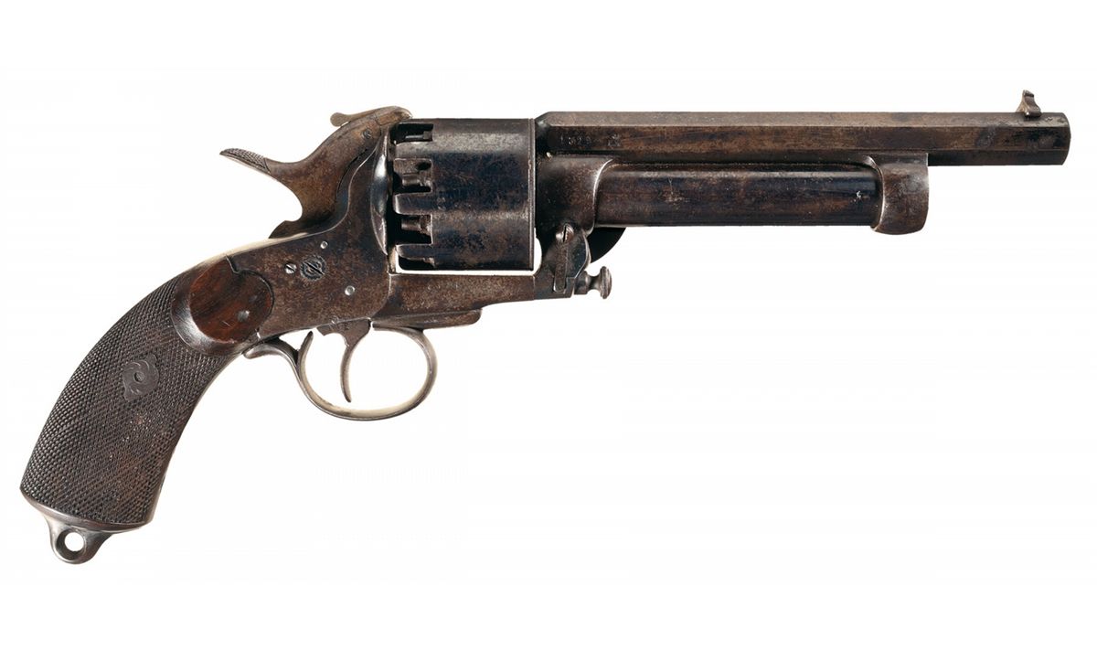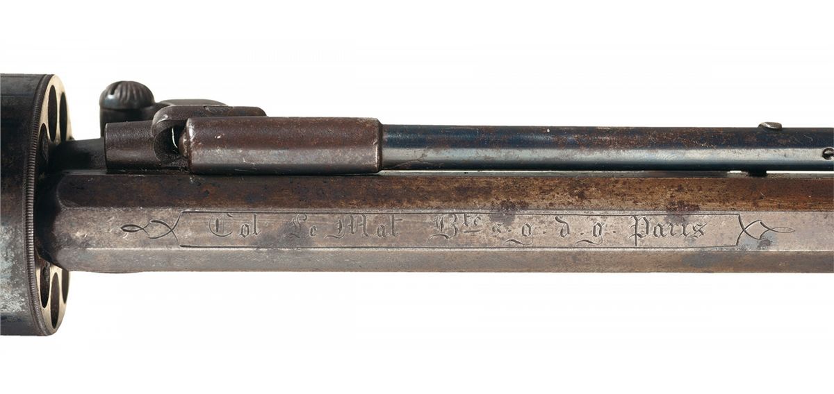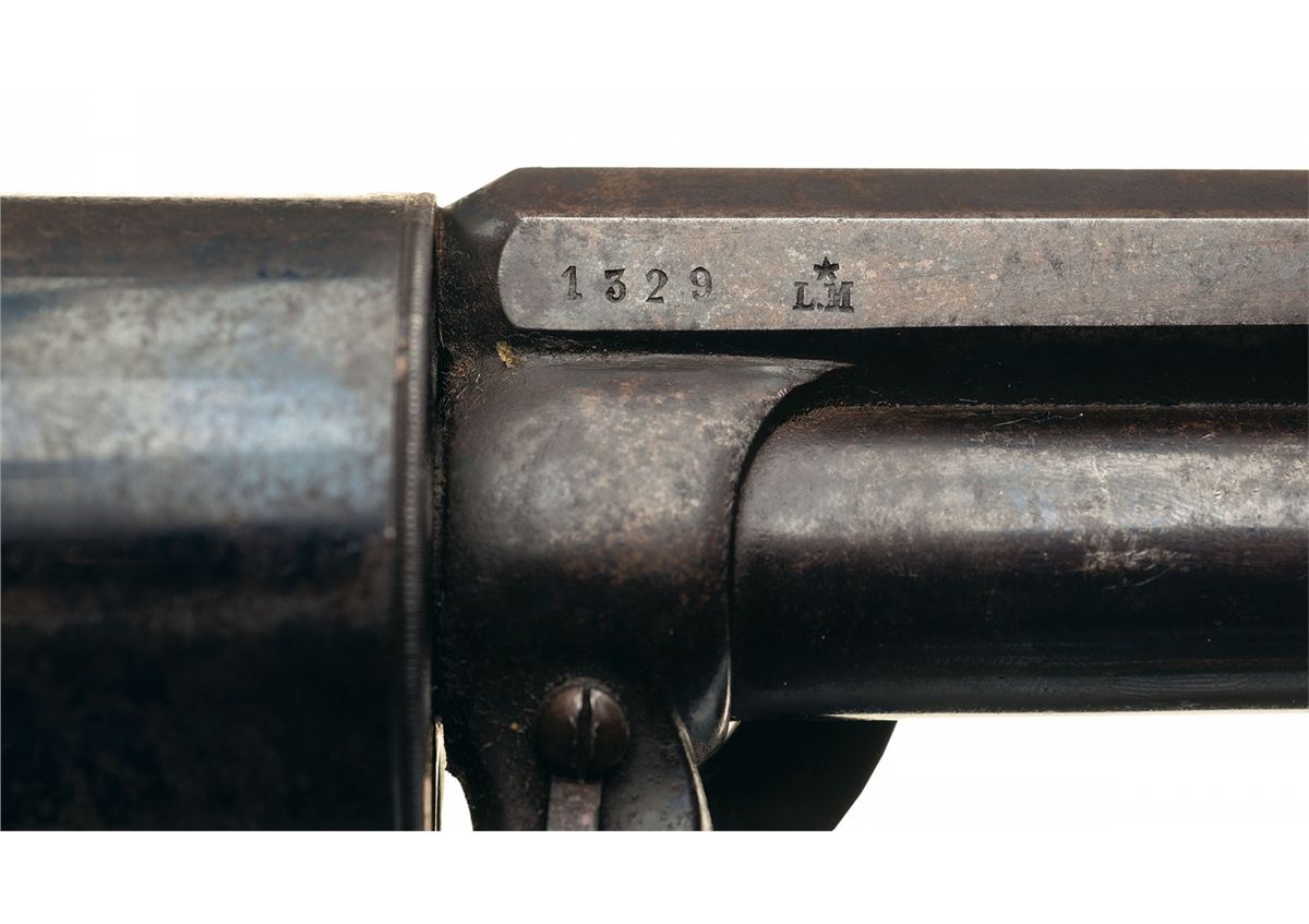 This Second Model LeMat revolver was manufactured in Paris, France c. 1864-1865. This revolver has the unique LeMat combination of a conventional .42 caliber barrel and percussion nine-shot cylinder which revolves on a centrally mounted smoothbore .63 caliber "buckshot barrel". The revolver has the distinctive Parisian features full octagon .42 caliber, revolver barrel, loading lever on the left side of the barrel, pivoting hammer nose with central change lever on the hammer spur, rounded trigger guard with no spur and lanyard ring hole in the boss on the butt frame. The revolver has a high polish blue finish and is fitted with two-piece finely checkered European walnut grips. The top barrel flat is engraved "COL. LeMAT, BTE. s.q.d.g. PARIS" in a panel with engraved flourishes at either end. The right side of the barrel is stamped with the serial number "1329" followed by the "*/LM" LeMat logo. The serial number "1329" is also visible on the right side of the frame below the cylinder and on the right side of the trigger. The cylinder is stamped with the serial number "1329". A "J" inspection mark is stamped on the left side of the hammer. The LeMat revolver was developed by Dr. Jean LeMat of New Orleans, Louisiana, and patented in 1856. LeMat revolvers were manufactured in Liege, Paris and Birmingham c. 1856-1865, total production is estimated at fewer than 2,900 revolvers. Approximately 1,500 LeMat revolvers are thought to have been purchased by the Confederate government during the Civil War. Many senior Confederate officers carried LeMat revolvers. However, the LeMat revolver is most closely associated with the famed Confederate cavalryman General J.E.B. Stuart who carried a LeMat revolver when he was mortally wounded at the Battle of Yellow Tavern, Virginia in 1864. The LeMat Two-Barrel revolver is the most distinctive of all Confederate associated firearms.