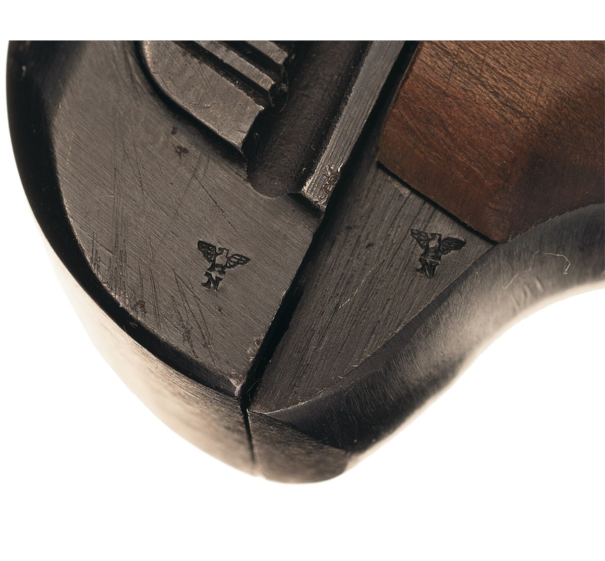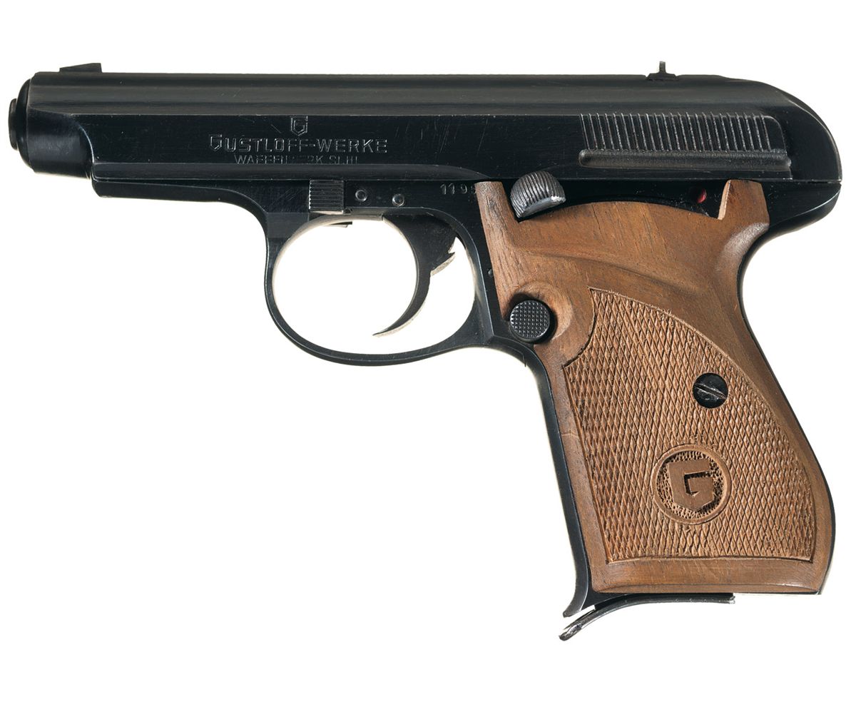 This is a rare experimental semi-automatic pistol developed in 1939 by the Gustloff-Werke factory intending to compete with the Walther PP/PPK pistols. The consignor stated that this was a WWII Vet purchase who served as an officer in the 11th Division which overran the Gustloff-Werkes factory in Suhl. Fritz Sauckel, an ardent Nazi and Gauleiter of Thuringia, was the founder of Gustloff-Werke factory and promoted the development of this pistol. It is a blow-back operated design with steel slide similar in shape to the Walther PP models albeit with a completely internal hammer design (enclosed rear end of the slide). Historical documents indicated that in January 1940 a prototype was submitted to Adolf Hitler with the suggestion that it be adopted for use by the various police agencies, and that production could be accomplished at the old Weimar factory using slave labor from the nearby Buchenwald concentration camp. However, due to the outbreak of WWII and large numbers of both Walther PP and PPKs pistol already in use throughout the German military, no order ever materialized. It is estimated that fewer than 100 of these rare prototype/early production pistols were ever manufactured. This is a later production example as it has an all "steel" frame, while most models encountered had the duraluminum frame similar to the Sauer Mod. 38 pistol. It has a sliding safety on the left side of the frame with a frame mounted magazine release. The left side of the slide is roll stamped with a stylized "G" above the two-line legend "GUSTLOFF-WERKE/WAFFENWERK SUHL", with the top having a raised serrated sight rib with a blade front sight and drift adjustable rear sight. The right side of the frame and slide both has a single "Eagle/N" Nazi commercial proof mark. The barrel is stamped "Kal.7.65 mm" over the chamber area. It is fitted with a set of walnut grips that are checkered on the lower 3/4 of each grip with the left grip having carved with a large circled letter "G". It is complete with one steel magazine that is numbered "195"on the base plate. The pistol has an all blued frame and slide clearly indicating that this pistol was a normal production model.