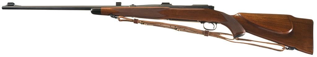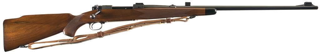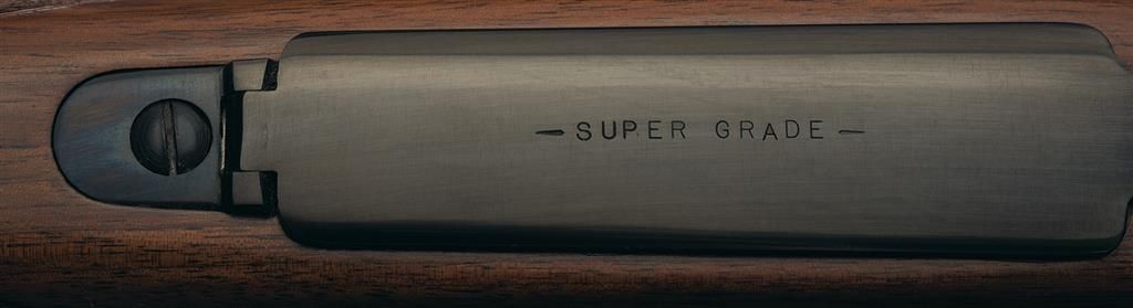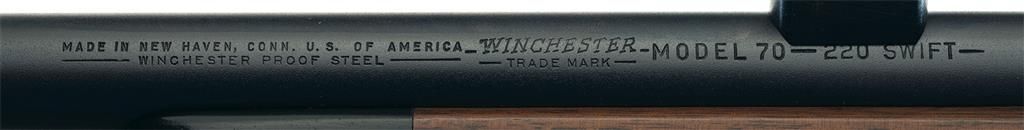 This example was manufactured in 1952. There were approximately 20,000 Model 70s manufactured in 220 Swift. This rifle is even more rare as it is a Super Grade. It has a 26 inch round barrel (standard for only the 220 Swift and 300 H&H Magnum) with a hooded stippled ramp front sight (blade sight removed with filler block added), the rear sight dovetail has a Stith Mounts filler block installed and there are scope blocks on the barrel and on the front receiver ring. Standard markings with a "W/P" in an oval Winchester proof on the barrel and receiver and "-SUPER GRADE-" on the hinged floor plate. The receiver has the "straight" tang. The bolt body is polished bright with the matching serial number "226329" on the bottom and has a "late" style safety. Fitted with a deluxe hand checkered pistol grip stock with raised cheekpiece, Winchester grip cap, contrasting forend tip and checkered steel buttplate. With leather sling and Super Grade sling swivels.