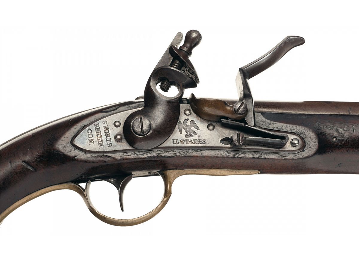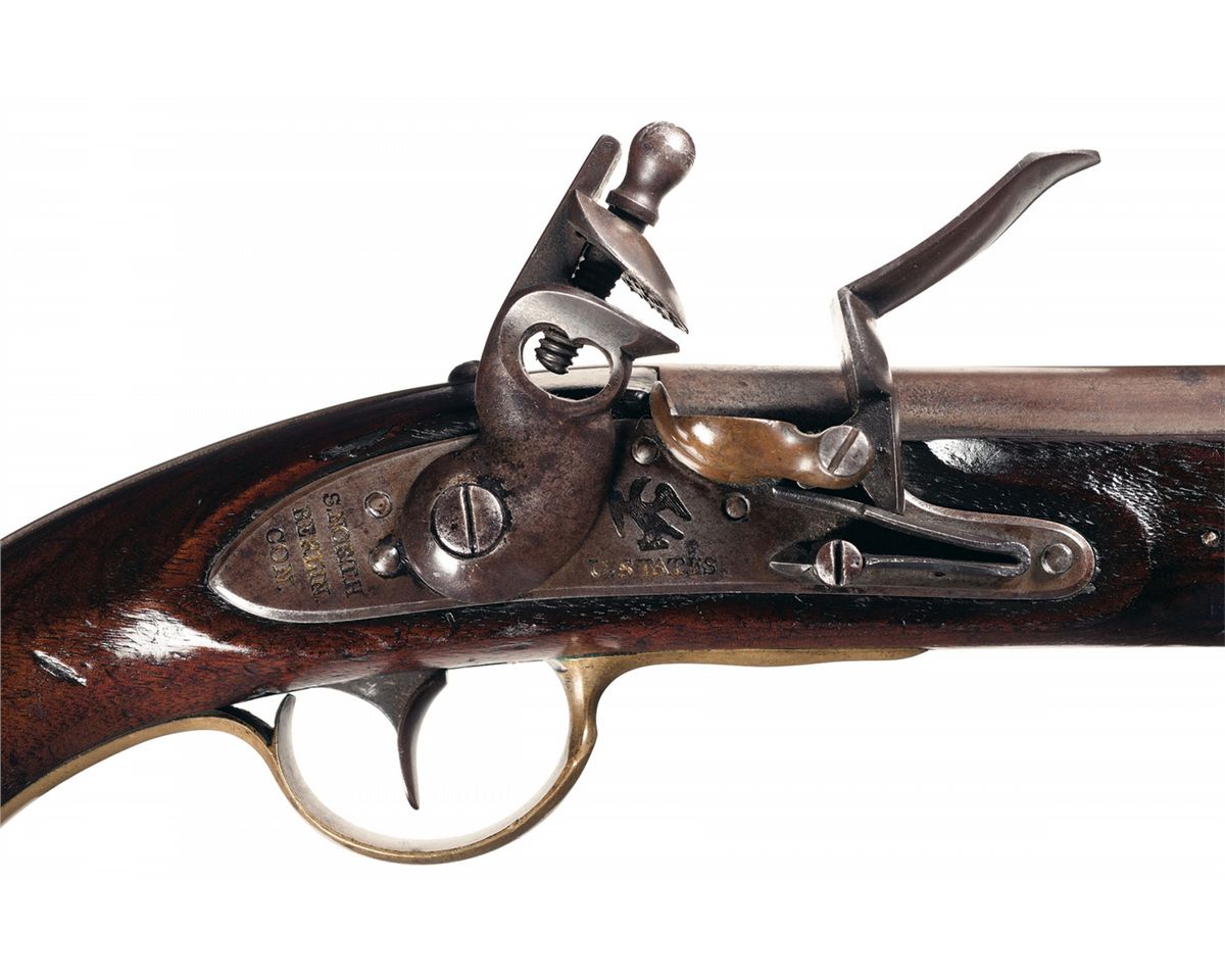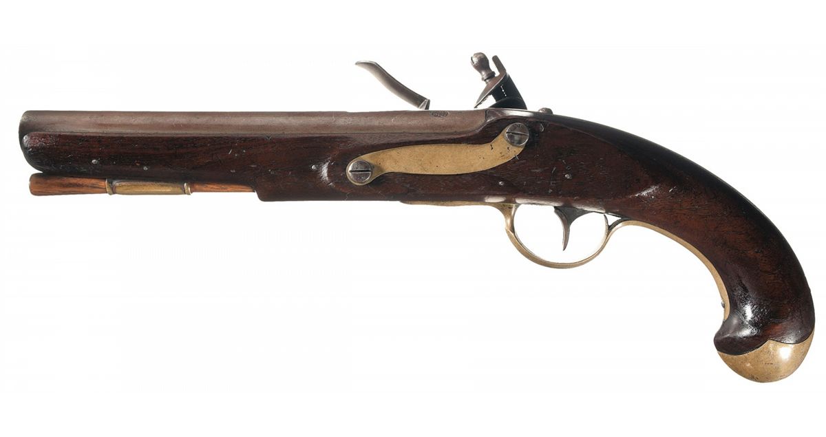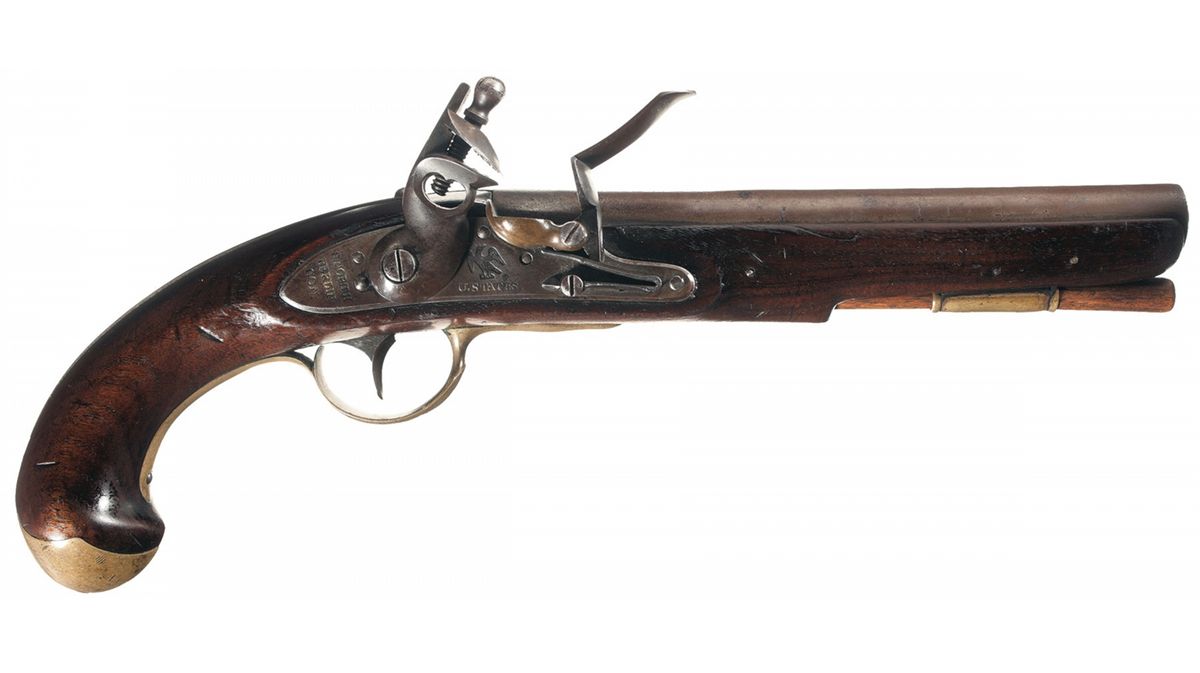 Condition: Very fine overall. The pistol is in the original flintlock configuration and is truly exceptional. The iron barrel and back strap have a handsome brown patina. There is shallow flash pitting surrounding the flash hole but the balance of the barrel and back strap are smooth. The barrel proof and inspection marks are sharp. The lock plate, hammer, frizzen and frizzen spring have a gray-brown patina with minimal flash pitting. The brass pan has a dark untouched patina. The beveled edges of the lock plate are sharp and the lock markings are very crisp. The brass buttcap, trigger guard and ramrod pipe have a mellow unpolished patina. The hickory ramrod is original to the pistol. The walnut stock is very good. The edges of the flats and barrel channel are sharp. Wear is limited to minor handling marks. This is an exceptional, original example of a rare North Model 1811 Army Contract pistol in the original flintlock configuration.