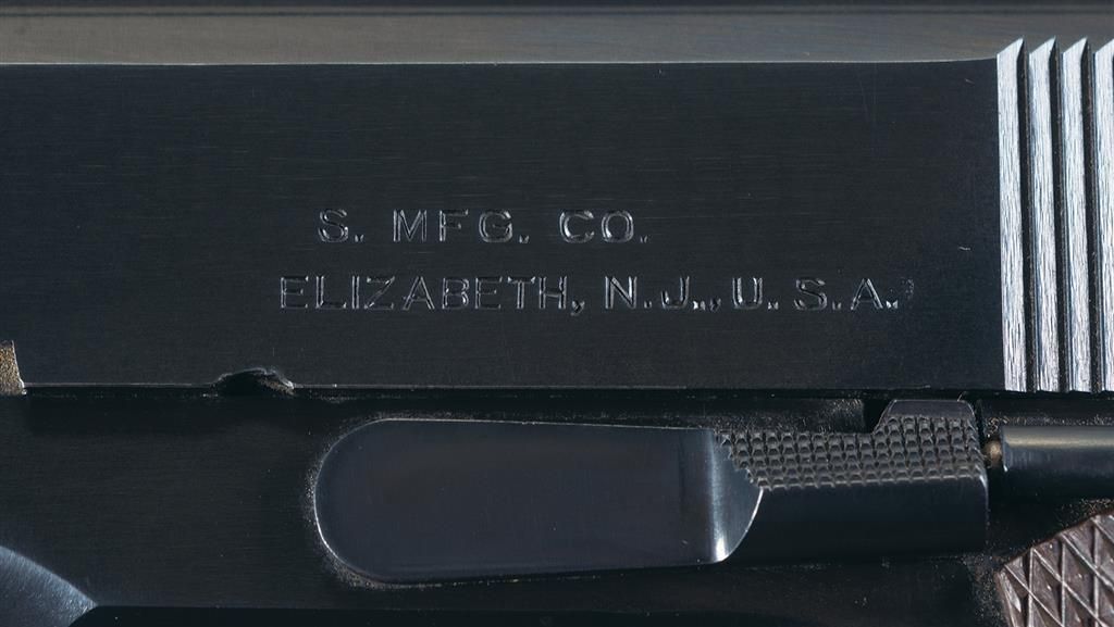This is a rare example of an exceptional Singer Sewing Machine Company, presentation type, M1911A1 semi-automatic pistol. The consignor stated that this pistol was given to him by an heir of the "Singer Sewing Machine Company." As we know there were exactly "500" Model 1911A1 pistols manufactured under U. S. Army, Ordnance Educational Order No. W-ORD-396, by the Singer Manufacturing Company during WWII. Most if not all were supposedly issued to the U.S. Army Air Corps. This was an extremely low number production run with examples in any condition being extremely rare and highly desirable. Now we have a true "Presentation Type", pistol as given to one of the heirs of the company with absolutely 99.9% of the original blue finish with absolutely no serial number or frame markings and never had any! This would certainly be the center piece of any M1911A1 collection and certainly the center piece of any Singer M1911A1 pistol collection. As noted, this example does not have any proof or acceptance marks. The only markings on the entire pistol is the slide, which is correctly marked in two lines "S. MFG.CO./ELIZABETH, N.J., U.S.A.". The various remaining parts; thumb safety, hammer, grip safety, barrel bushing, recoil spring cap, magazine release button were all produced and blued at the same time as the frame. Even the grips are the correct early Singer patterns that have the hollowed out back sides with no reinforcing webs with no mold markings, with no reinforcing rings around the screws. This is just an outstanding example of a rare, one of a kind Singer family presentation M1911A1 pistol. Magazine absent.