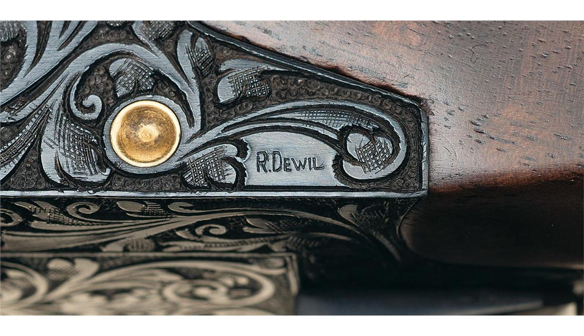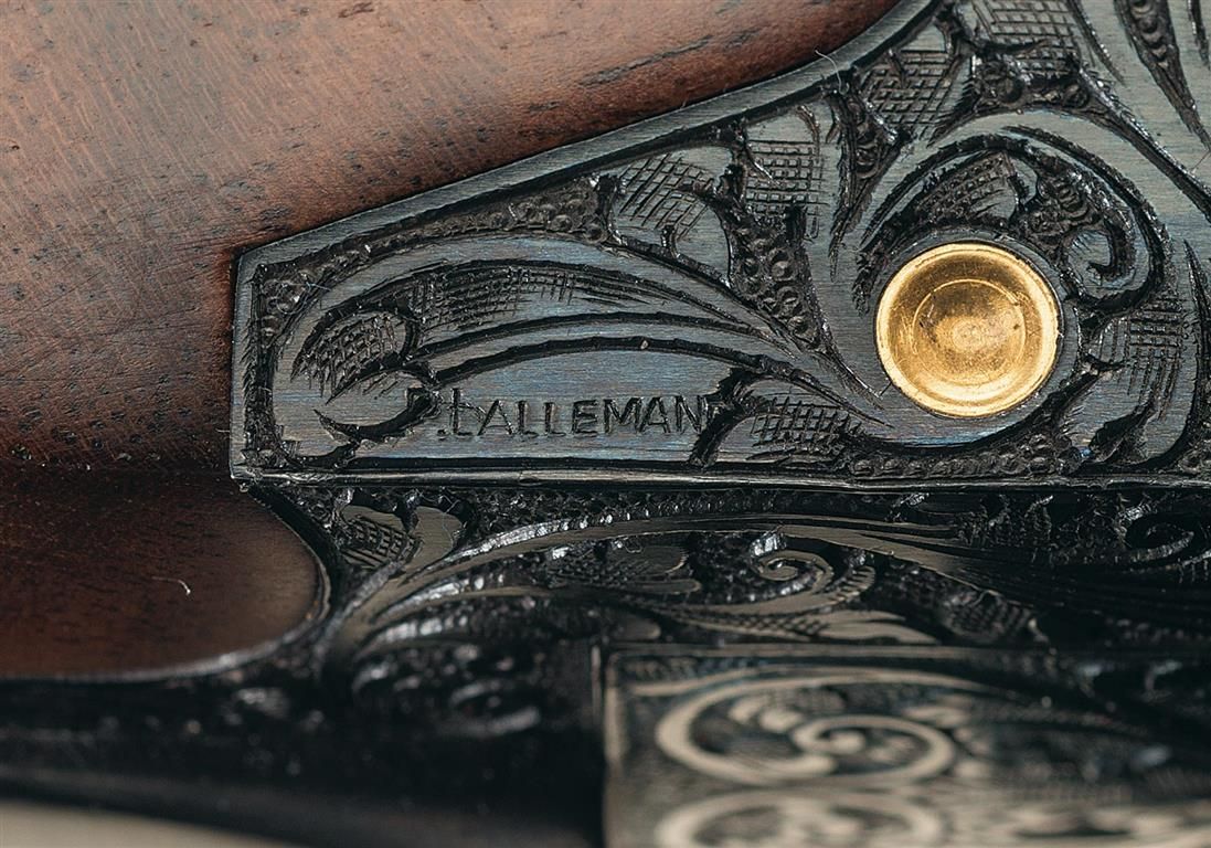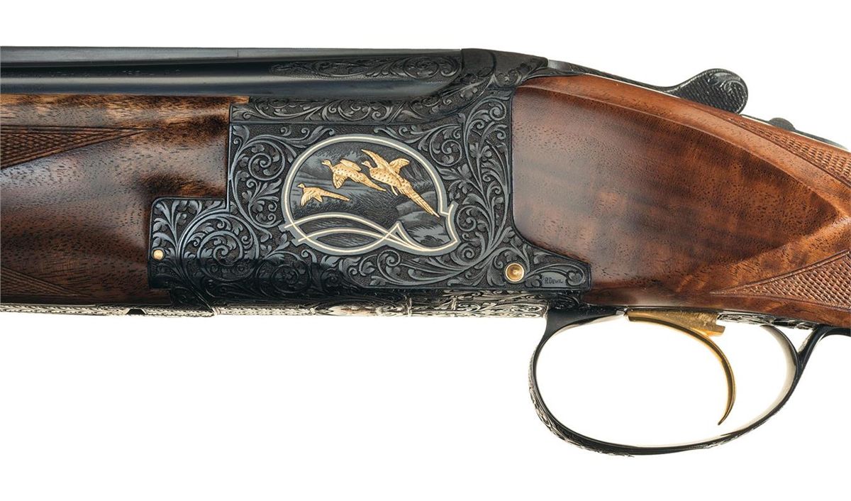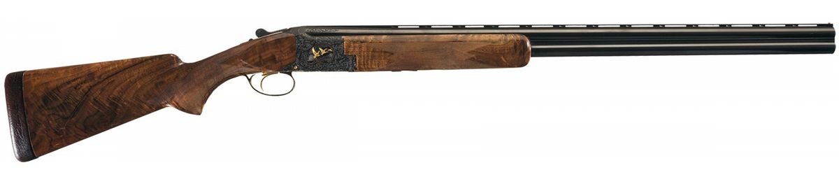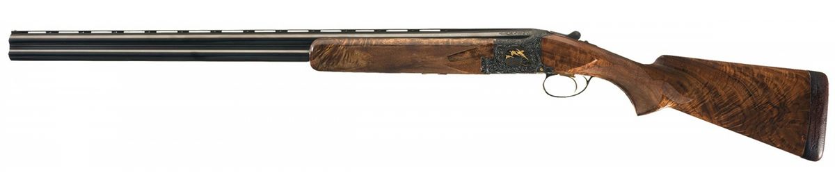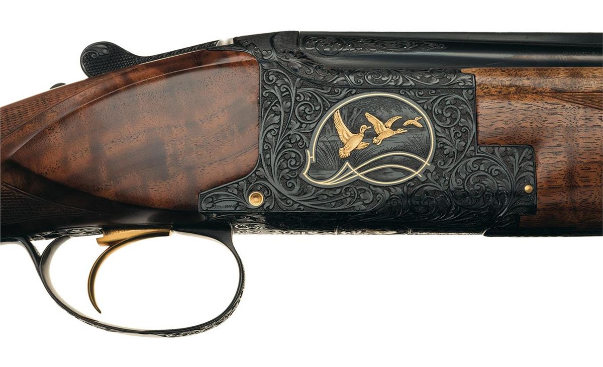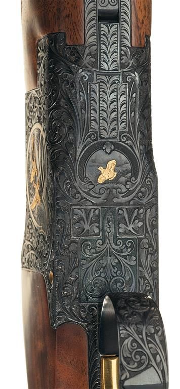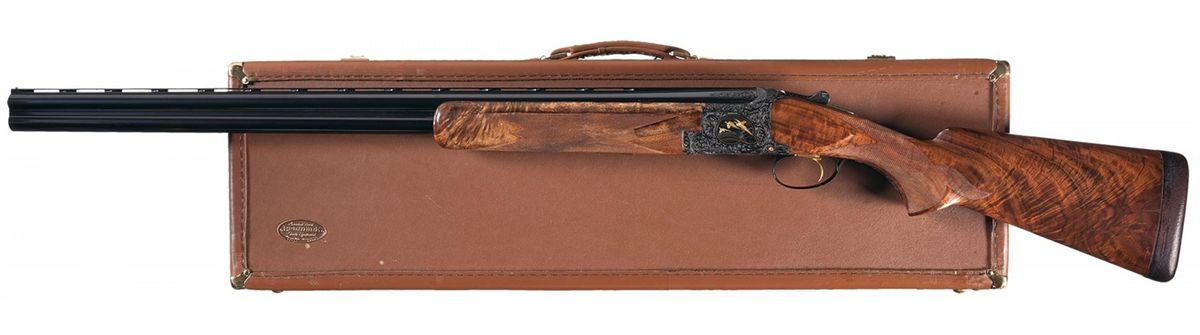 Manufactured in Belgium in 1976. Single ivory bead sight on the matte vent rib, choked full/modified and chambered for 2 3/4 inch shells with ejectors. Blue action with relief Germanic style floral scroll engraving with punch dot background and gold inlaid pheasants on the left side of the receiver in a field scene, ducks on the right side in a marsh scene and a quail on the underside. The game scenes on the sides of the receiver also have gold wire bordering. The trigger guard, two inches of the breech end of the top barrel on each side, forearm release assembly, knuckle, bottom of the barrel lugs, upper tang and break lever are also nicely engraved in the same patterns. The left side of the receiver is signed "R DEWIL" and the right side "P LALLEMAN". Gold washed single selective trigger and tang safety/selector with gold letters. The receiver pins and firing pins are also gold plated. Mounted with a beautiful highly figured deluxe walnut forearm and pistol grip stock with multi-point fine line checkering and a brown leather covered solid rubber recoil pad. Length of pull is 14 3/8". Complete in a Browning hard leather takedown case with combination locks, brass hardware, including corner protectors and wine colored velvet lining with gold embroidered "BROWNING" logo on the inside of the lid.