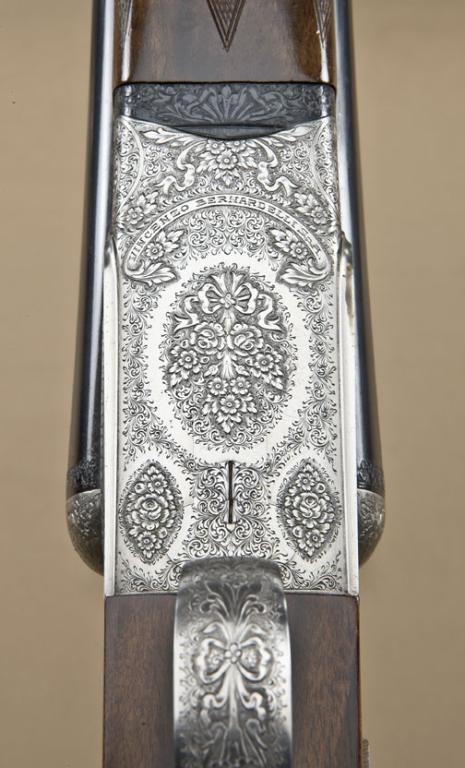 Exceptional pair of Bernadelli 12ga side by side shotguns with Holland and Holland style hand-detachable sidelocks, finely scroll engraved in floral motifs, English style straight grips, single triggers, autoejectors, hand-filed non-ventilated ribs, and general best-quality workmanship throughout. Serial #2422 and 2423. See lot #278 for consecutive two-gun cased set. Both guns show 26” barrels. Barrel #1 is choked approx.“Modified” (right) and “Modified”. Barrel #2 is choked approx. “Improved Cylinder” (right) and “Modified” (left). The stocks measure 14-7/8” from the trigger to the end of the checkered wood butt. The pair are blued withbright French grey frames and actions. The Bernadelli case and owner’s plaque are factory marked “R.E.P.”, with extra pair of locks engraved to match for each gun, with original paperwork. In fine to excellentcondition showing just slight use, possible test-firing only, 98%-99%. Several old-time shotgun dealers have viewed this pair and Lot 278 and all concurred that they had never seen a higher grade pair of Bernadelli guns.