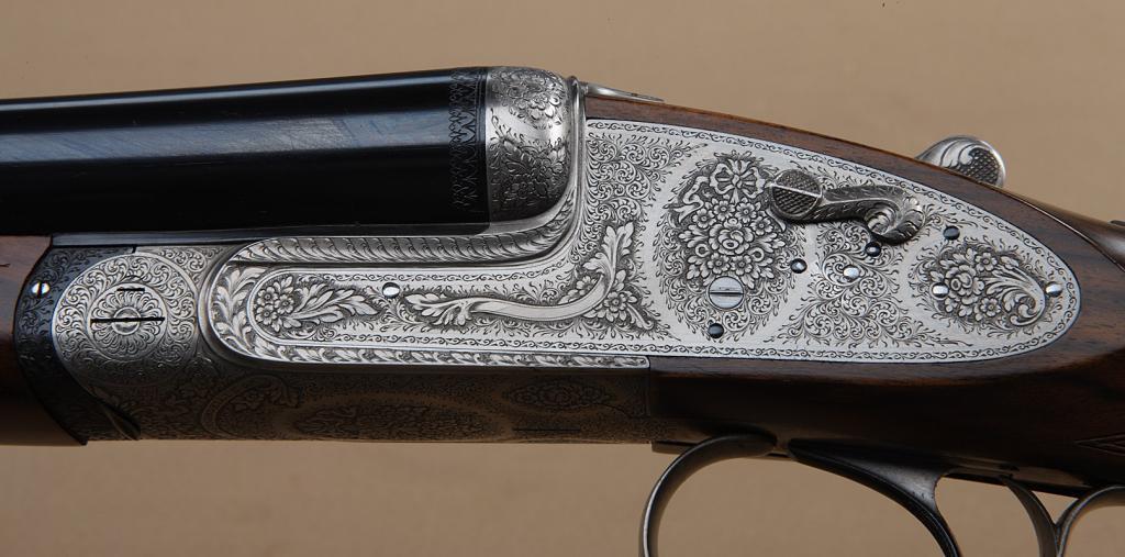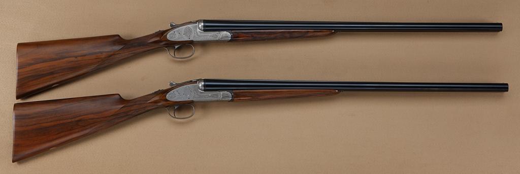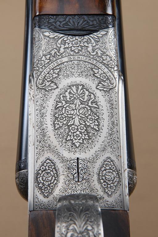 Exceptional pair of Bernadelli 12ga side by side shotguns with Holland and Holland style hand-detachable sidelocks, finely scroll engraved in floral motifs, English style straight grips, single triggers, autoejectors, hand-filed non-ventilated ribs, and general best-quality workmanship throughout. Serial #2424 and 2425. Both guns show 27-1/2” barrels. Both are choked “Cylinder” (right) and “Improved Modified” (left). Thestocks measure 14-7/8” from the trigger to the end of the checkered wood butt. The pair are blued with bright French grey frames and actions. The Bernadelli case and owner’s plaque are factory marked “R.E.P.”, withextra pair of locks engraved to match for each gun, with original paperwork. In fine to excellent condition showing little to almost no use, possible test-firing only, 99% plus. Several old-time shotgun dealers have viewed this pair, and all concurred that they had never seen a higher grade pair of Bernadelli guns. From the Robert Petersen collection. Est: $6,000 - $12,000