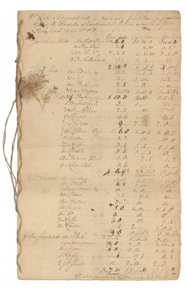 Manuscript Document Signed by twelve New Haven, Connecticut, Selectmen. Eighteen pages, 8” x 13 ¼”. November 20, 1778. New Haven. The document lists nearly one hundred soldier’s names along with an itemized list of the supplies given to their respective families, totaling over 850 Pounds. The detailed nature of this list is truly extraordinary, with each family’s list containing a unique assortment of items clearly offered with attention to their unique needs. Aside from a varied assortment of foodstuffs, some families were also provided with cloth, wood, candles, wool and even alcohol. A truly exceptional item from America’s Revolutionary Period. Document bound with twine at right edge. Some slight paper loss at edges. Overall Very Fine.