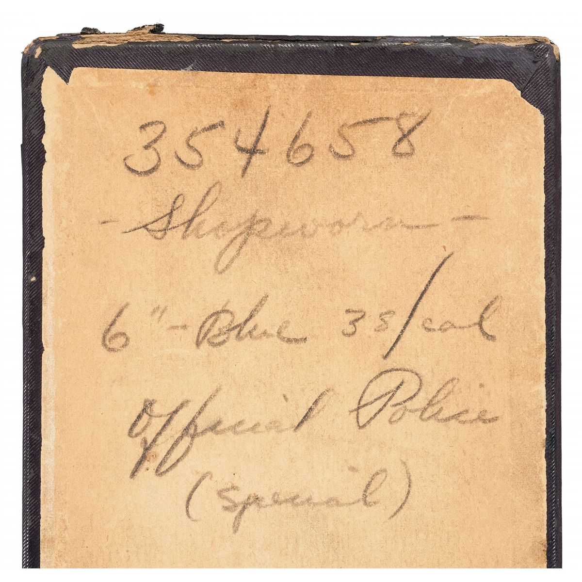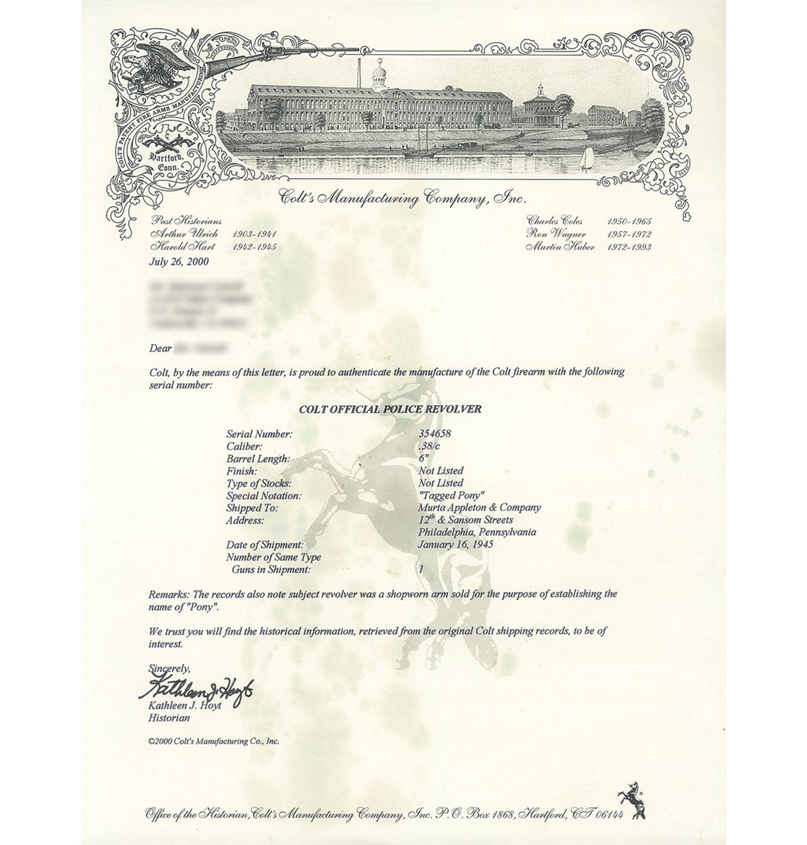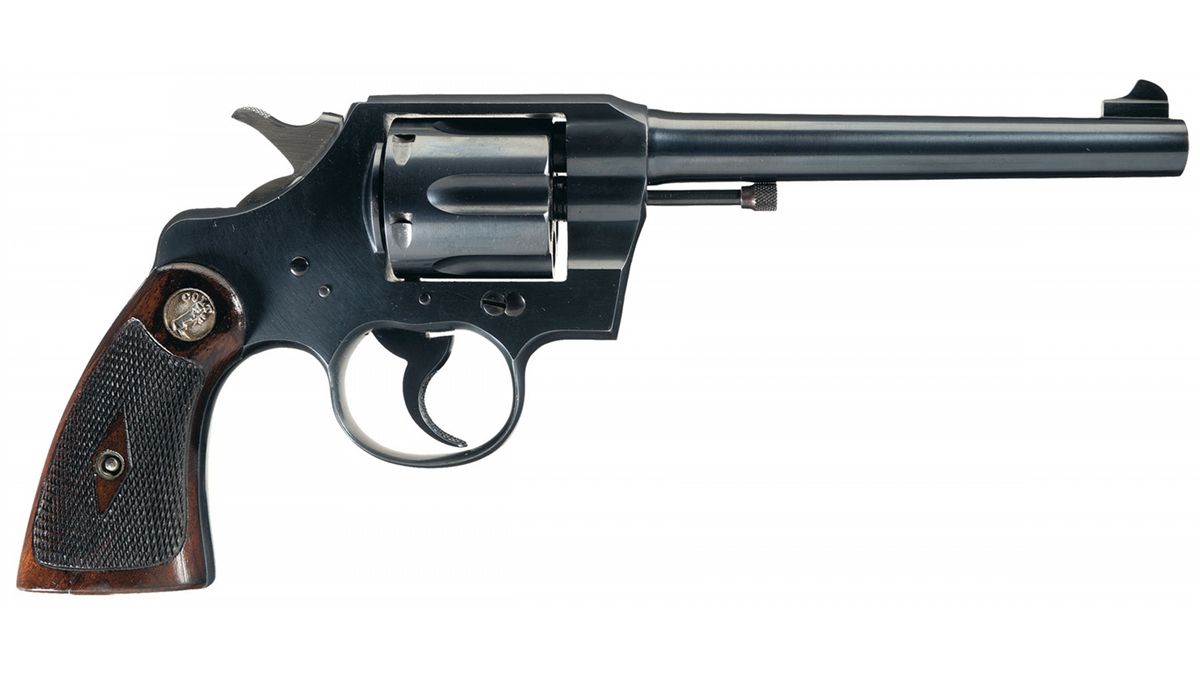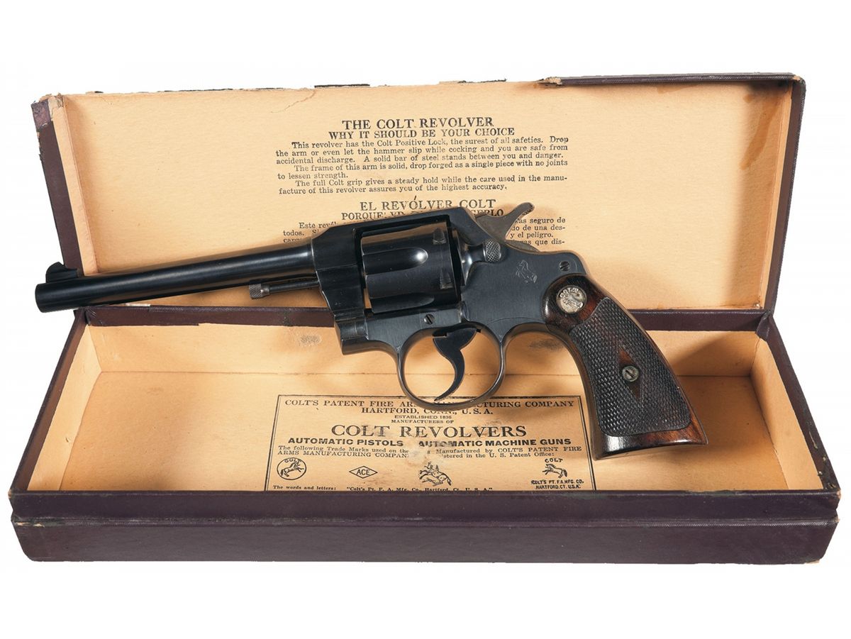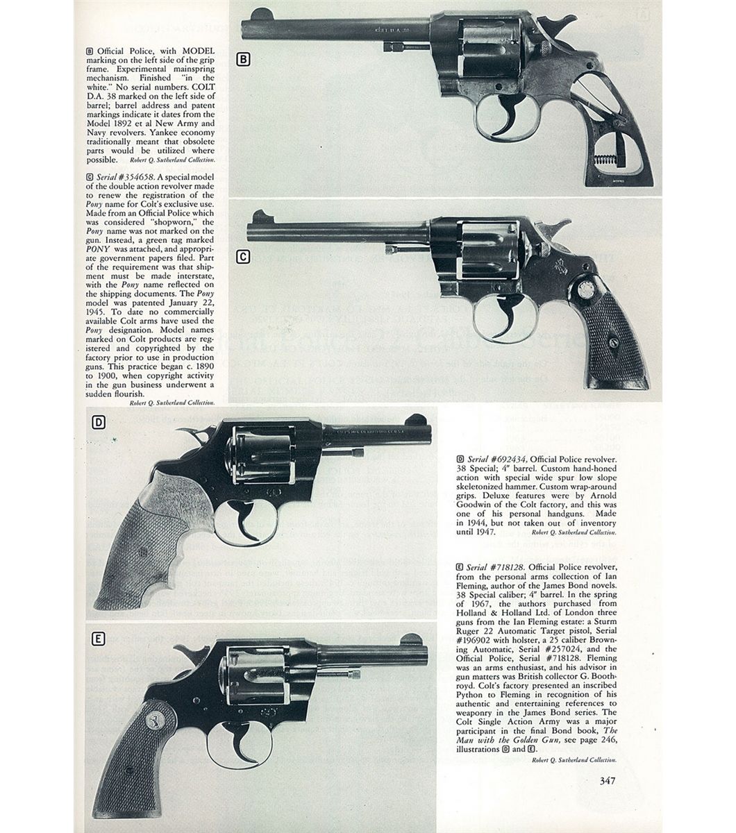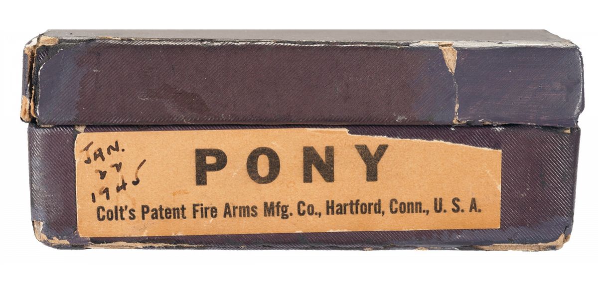 This is an excellent example of an extremely rare Colt "Pony" revolver that was manufactured in 1945. This revolver is pictured, identified by serial number and briefly described on page 347 of "The Book of Colt Firearms" by Wilson and Sutherland and was once in Robert Sutherland's collection. The revolver is nearly identical to an Official Police revolver and was considered "Shopworn". It was intended to renew the registration of the "Pony" name for Colt's exclusive use. The Pony name is not on the revolver, however when it was made a green tag marked "Pony" (not included), was attached and the proper governmental papers were filed. The Pony Model was patented on January 22, 1945. This model names marked on Colt firearms are registered and copyrighted by the factory prior to manufacture. This revolver has no barrel markings, has the Rampant Colt on the left side of the frame, the matching serial number is marked on the frame and crane, and the Colt triangle "VP" proof and the number "7" assemblers number on the front and rear, left upper side of the trigger guard respectively. The barrel is fitted with a blade front sight that sloops downward at the rear and has a stippled rear face, and it has the standard square notch rear sight in the top strap. The revolver has an all blue finish , polished hammer sides and checkered trigger, cylinder release and hammer spur. Fitted with checkered walnut grips with silver Colt medallions. The accompanying factory letter verifies the serial number, caliber, barrel length, with finish and grips as "Not Listed", special notation "Tagged Pony" and that it was shipped as 1 to Murta Appleton & Company, 12th & Sanson Streets, Philadelphia, Pa. on January 16, 1945, where it was to have the Pony trademark established. Remarks on the factory letter state "The records also note subject revolver was a shopworn are sold for the purpose of establishing the name of "Pony"." Interesting enough the Colt Pony is a .380 semi-automatic pistol introduced in 1997. The revolver is complete with the original maroon hinged lid box with end label that reads "PONY/Colt's Patent Fire Arms Mfg. Co., Hartford, Conn., U.S.A." and hand written notation "JAN./22/1945". The bottom of the box is marked in pencil "354658/Shopworn/6"-Blue 38/cal/Official Police/(special).