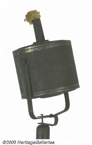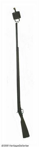 <B>Exceptionally Nice, Classic Circa 1860 "Rifle Torch"</B></I> One of the most popular types of parade torches, "rifle torches" nicely complimented the military-style uniforms worn by many marching units. According to Collins, this form, with swivel-mounted torch and percussion lock mechanism, are consistent with the earliest 1860 examples (page 20). This is one of the nicest examples we have seen, owing to its realistic detail (the trigger and hammer mechanisms are metal and actually work) and exceptional condition. Length 69". Lot:259