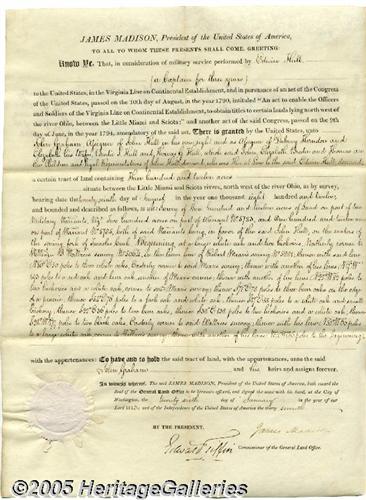 <B>Exceptionally Nice James Madison Signed Land Grant</B></I> James Madison, fourth U.S. President (1809-1817). Beautiful condition on this 12" x 15.5" vellum document, which awards land in the Northwest Territory to a former captain of the Virginia Line. Original seal attached. The only "imperfection" is the original creases from folding into sixths, and even they lack the usual browning and/or deterioration one usually sees along these lines. Very attractive display presence. <I>Accompanied by COA from PSA/DNA.</B></I>