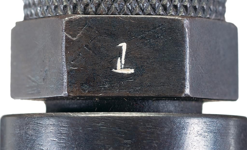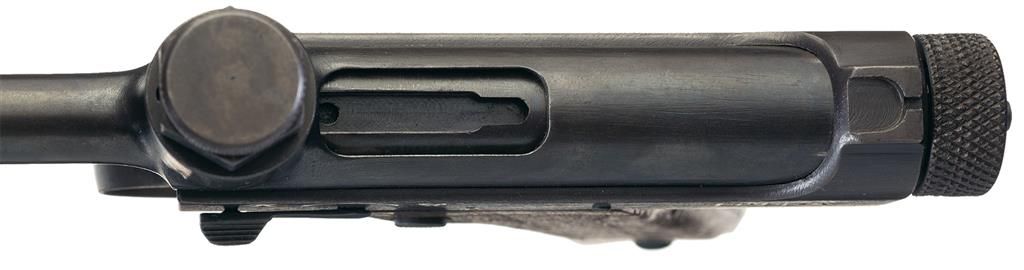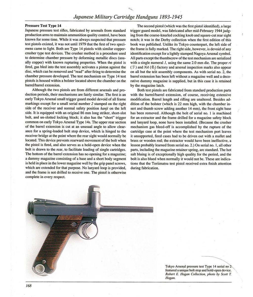 This is a rare example of a late WWII Japanese Type 14 Nambu pressure test pistol with this example being produced by the Nagoya Arsenal. This beautiful all original pistol has been extensively discussed and written up on pages 168-170 of the reference book: "Japanese Military Cartridge Handguns 1893-1945" by Derby and Brown. This pistol as noted is the only example to have survived WWII as manufactured by the Nagoya Arsenal and may have been the only one to ever have been manufactured there. As noted in the pictures upper barrel assembly of this example has been extensively modified by the Arsenal for use as a pressure test pistol. As noted it the article it is serial number "1" and has all matching parts to include the magazine. These pistol were manufactured using original Nagoya Arsenal parts, that were machined, fully assembled and finished. The purpose of these pistols was to specifically check the pressures and quality of 8 mm Nambu ammunition as manufactured by the various ammunition companies during WWII, just like the U.S. military also during WWII. As noted in the article the left side of the slide has the full arsenal markings, while on the right side it is only marked with the Nagoya Arsenal mark and no other markings or proofs, as it was never going to leave the factory. It has never had an extractor installed as it would not work