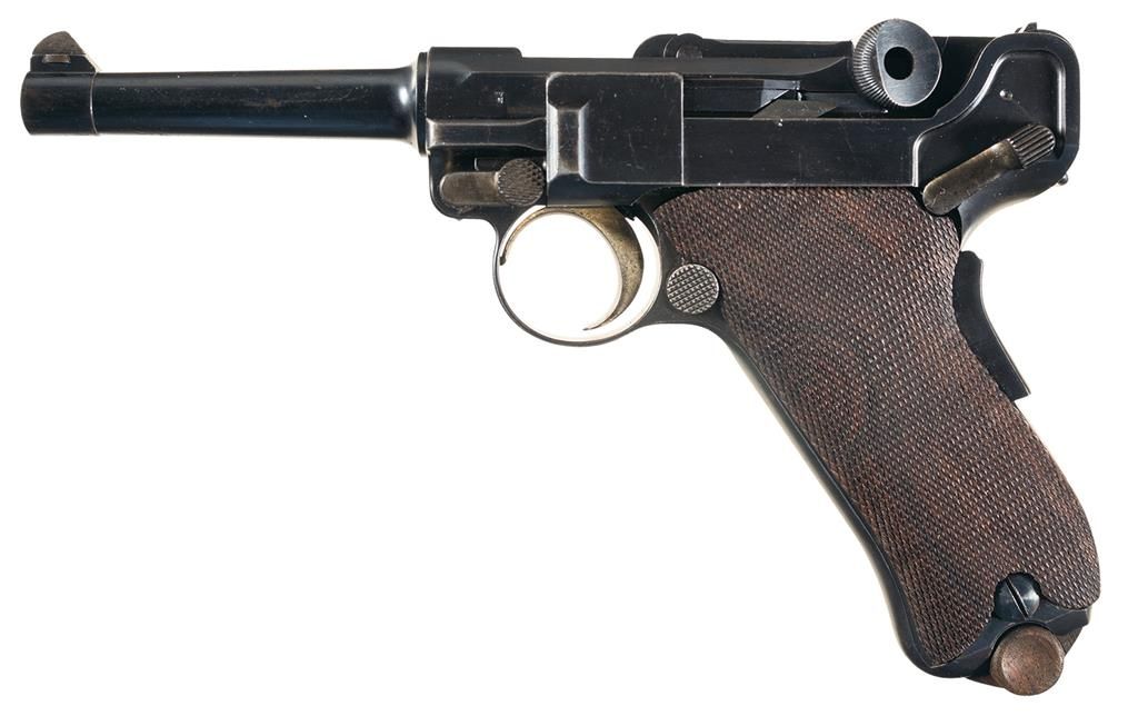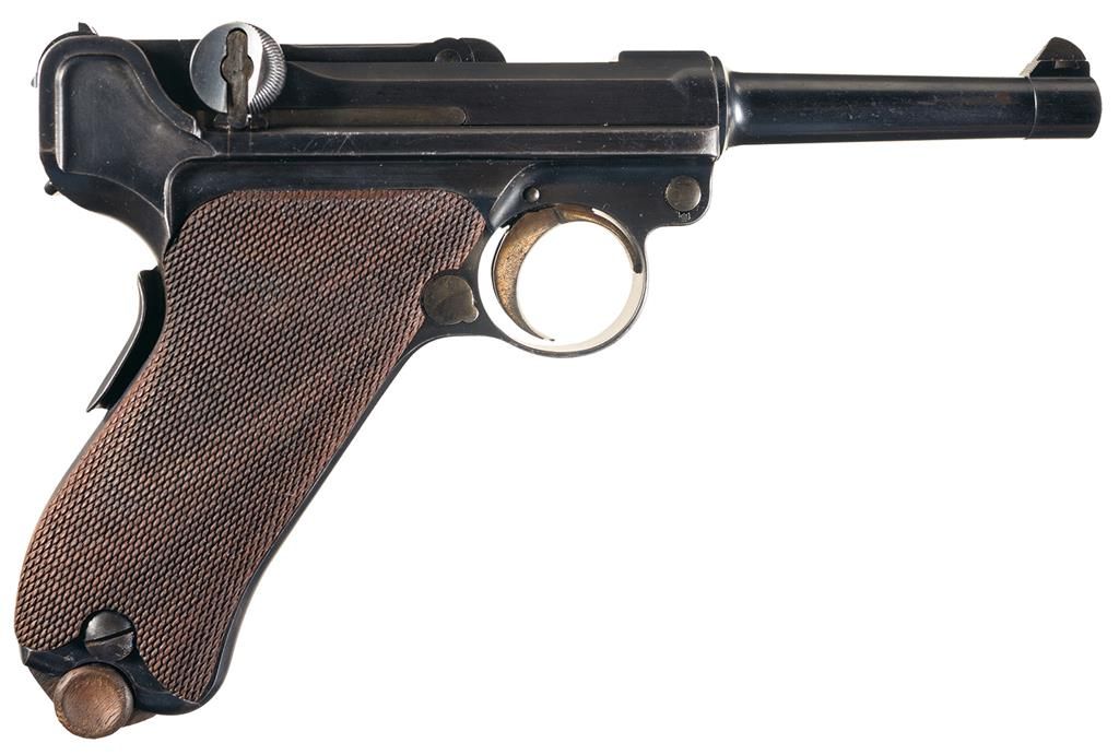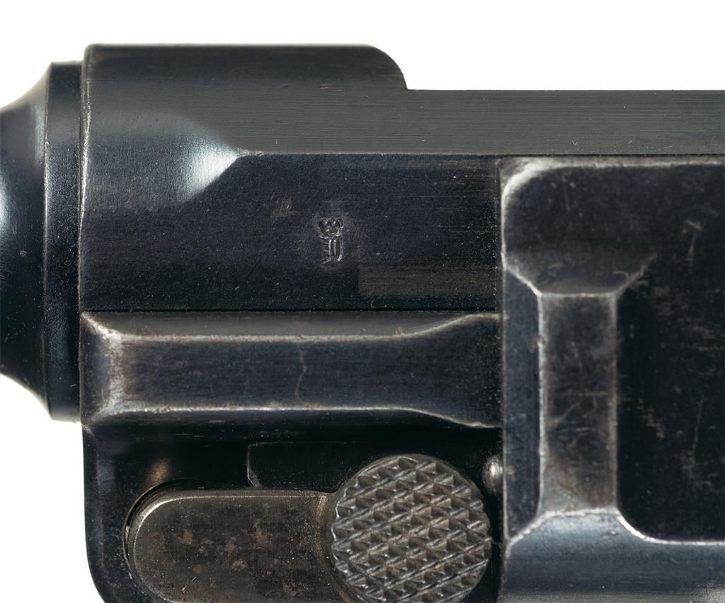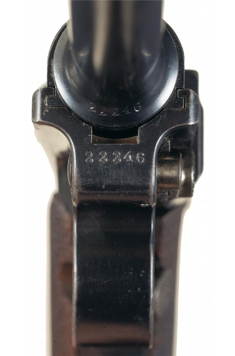 This is a very fine example of a very rare 1902 Danzig Test Luger that was produced by the DWM factory. It is theorized that these pistols were produced for the early Imperial German Army tests at the time the Luger pistol was being considered for acceptance. There were approximately 50 of this model actually produced and they fall into a generally accepted serial number range of approximately 22,240-22,400 with this one being produced in the lower serial number range. These pistol have all the early characteristics of the 1902 design with the dished toggles with toggle lock on the right side, flat recessed breechblock, grip safety, fat barrel with this example being in the 7.65mm Luger caliber. There are no actual factory markings on the toggle link of these Lugers (not even the DWM Logo) except for a small Script letter "D" proof indicating acceptance by the Danzig Arsenal. This proof and the serial number range are the only ways to authenticate these scarce Lugers. On this example the script letter "D" proof is located on the left side of the barrel extension. These pistols were numbered in the commercial manner with the full serial number (22246) on the frame and underside of the barrel with the last 2-3 digits, of the serial number on the various smaller parts. It is fitted with an original, early nickel plated magazine body with a walnut base with a small DWM proof. The pistol is fitted with a set of replacement checkered walnut grips.