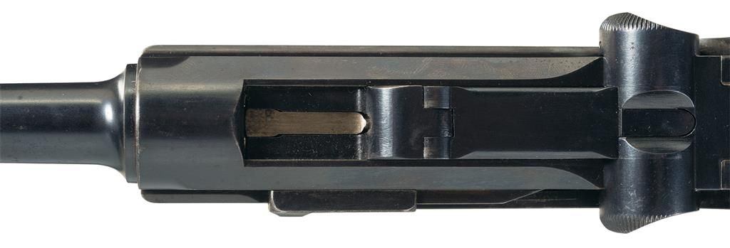 Very fine with 87% plus of the original blue finish overall with wear and blue loss on the 50% original straw colors remain. High spots, front of the frame rails and side plate hump, with general thinning on the grip straps. The replacement grips are very nice with nice distinct checkering overall that are slightly oversize. Mechanically excellent. A really nice, high end, and very rare early German Army Danzig Test Luger pistol.