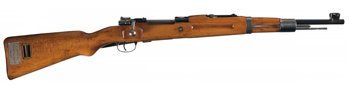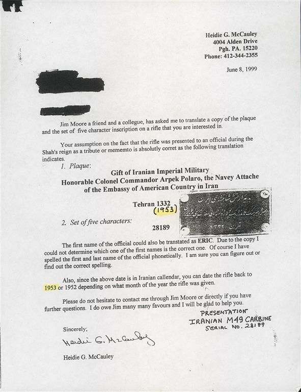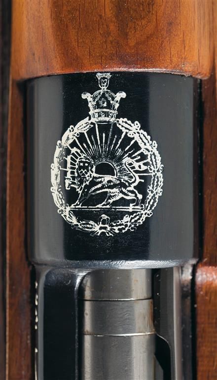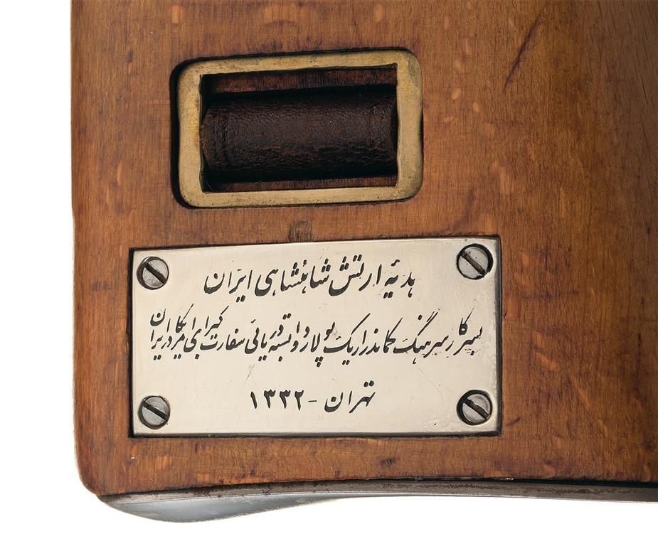 This is an example rare pre-war M49 carbine as manufactured by the Iranian State factory, that was presented as a gift in 1953 by the Iranian Military to Commander Eric Pollard. This carbine and its history is intriguing in that there are accompanying documents, which indicate that as the Naval Attache, Commander Eric Pollard, probably worked for the C.I.A. at that time at the Embassy, and later also served as a "Special Assistant For Counterinsurgency and Special Activities" at the Embassy. During this time he was probably heavily involved with assisting the British in the actual overthrow (coup d'e'tat) of the democratically elected, then Prime Minister Mohammad Mosaddegh, and the reestablishment or appointment of General Fazlollah Zahedi as the new Primer Minister of Iran. The consignor also states that Commander Pollard also accompanied the Shah of Iran to Switzerland while this overthrow was taking place to help mask his knowledge of this action. Also accompanying this rifle is a telex (dated 5 Sept 1953) from General Zahedi to the U.S. Ambassador of Iran, in which the General wishes to "Expresses his gratitude for the praiseworthy attitude and efforts (of Commander Pollard) to strengthen the friendly relations between Iran and the U.S.". All this took place while under the Pro-Western regime of the Shah of Iran; Mohammad Reza Pahlavi. Remember he was the last Shah (King) of Iran in power in 1979 when he was overthrown by the fundamentalist Muslim group of Clerics headed by Ayatollah Khomeini. Certainly this is not only a very unique, one of a kind carbine, but also a very significant "Cold War" historical carbine. These carbines are fairly rare in their own right with this one being even more rare/desirable in that it has a small silver plaque attached to the right side of the buttstock attesting to it being presented to Commander Pollard. This carbine is accompanied by other documents to support its history, one being a translation of the silver plaque that reads; "Gift of Iranian Imperial Military/Honorable Colonel Commander Arpek Polaro, Naval Attache of the Embassy of American Country in Iran/Tehran 1953/28189". Also with this carbine is some historical information. These carbine are an exact duplicate of the Czech Model 30 carbine only they exhibit all markings in Farsi. The top of the receiver is marked with the large Persian Crest and the left side of the receiver markings (serial number and factory name) are all in Farsi. It has the large military tangent rear sight graduated to 2,000 meters with the milled trigger guard and barrel bands. These carbines have two unique features one is the top handguard that extends from the receiver ring to the front barrel band and the other is an integral set of front sight protectors. The stock and handguard are both the correct beech wood and the right side of the buttstock has the matching Farsi numbers. It is complete with an original cleaning rod under the barrel. This carbine has been given a high polished blue finish overall with a highly polished hardwood stock and handguard, and original sling with bright polished barrel bands and complete bolt assembly.