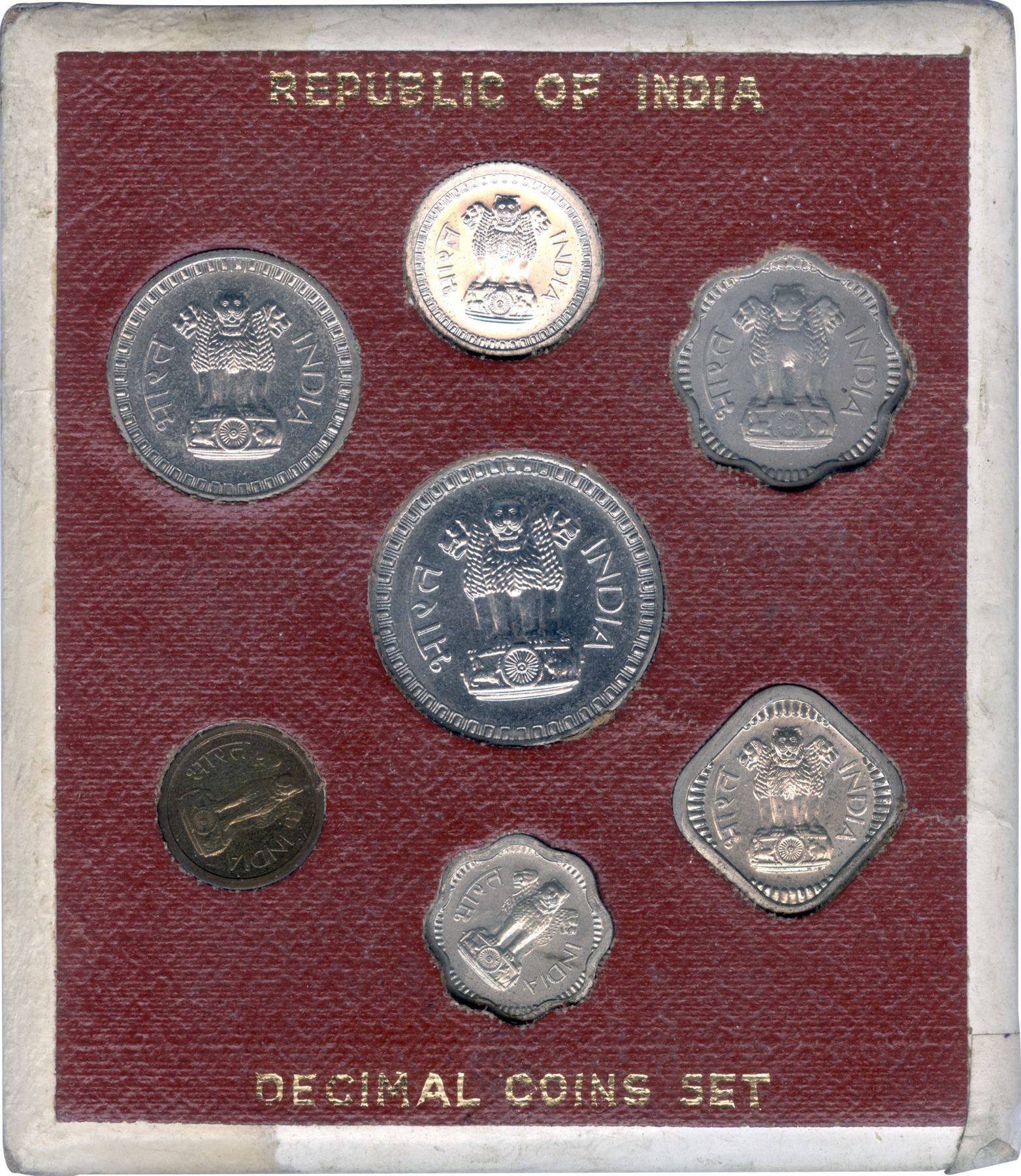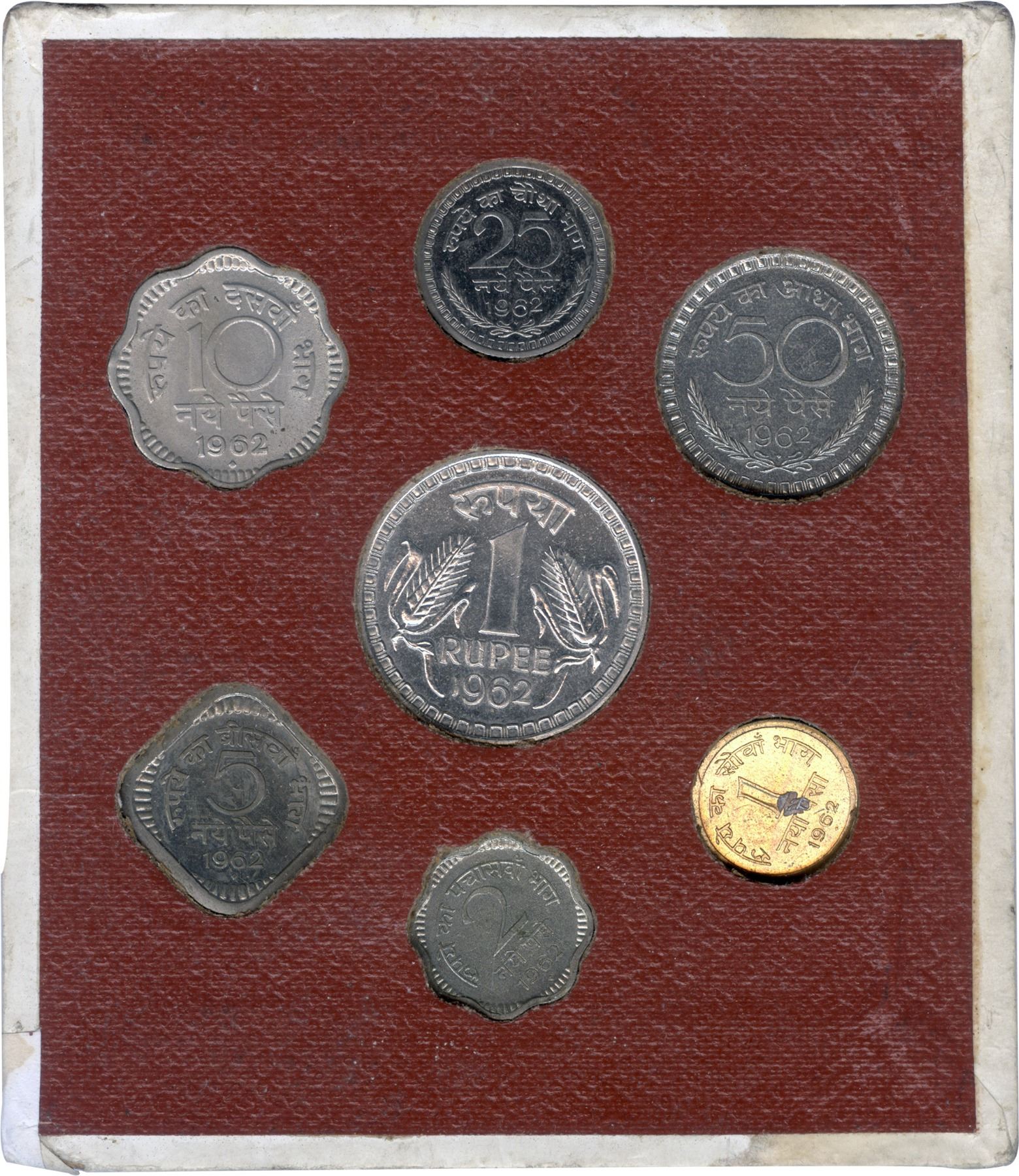 Republic India, 1962, Proof Set, Decimal Coins Set (Regular Series), Set of 7 Coins, 1 Rupee, 50 Naya Paise, 25 Naya Paise, 10 Naya Paise, 5 Naya Paise, 2 Naya Paise and 1 Naya Paise, Bombay Mint, (RB # 5), packed in original red cardboard, Rupee struck from Calcutta mint without a mint mark, this is the only set in Republic India where the set contains a coin struck at the different mint, proof, Exceptionally Rare.