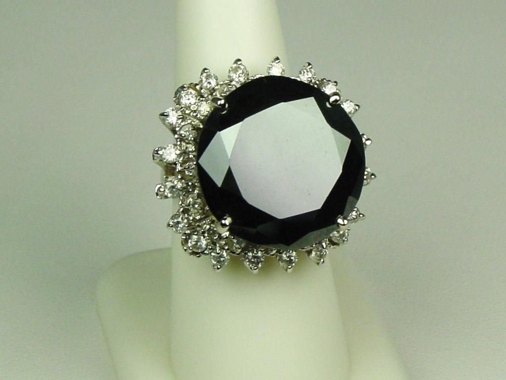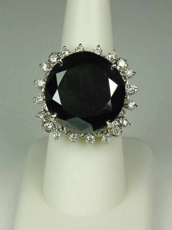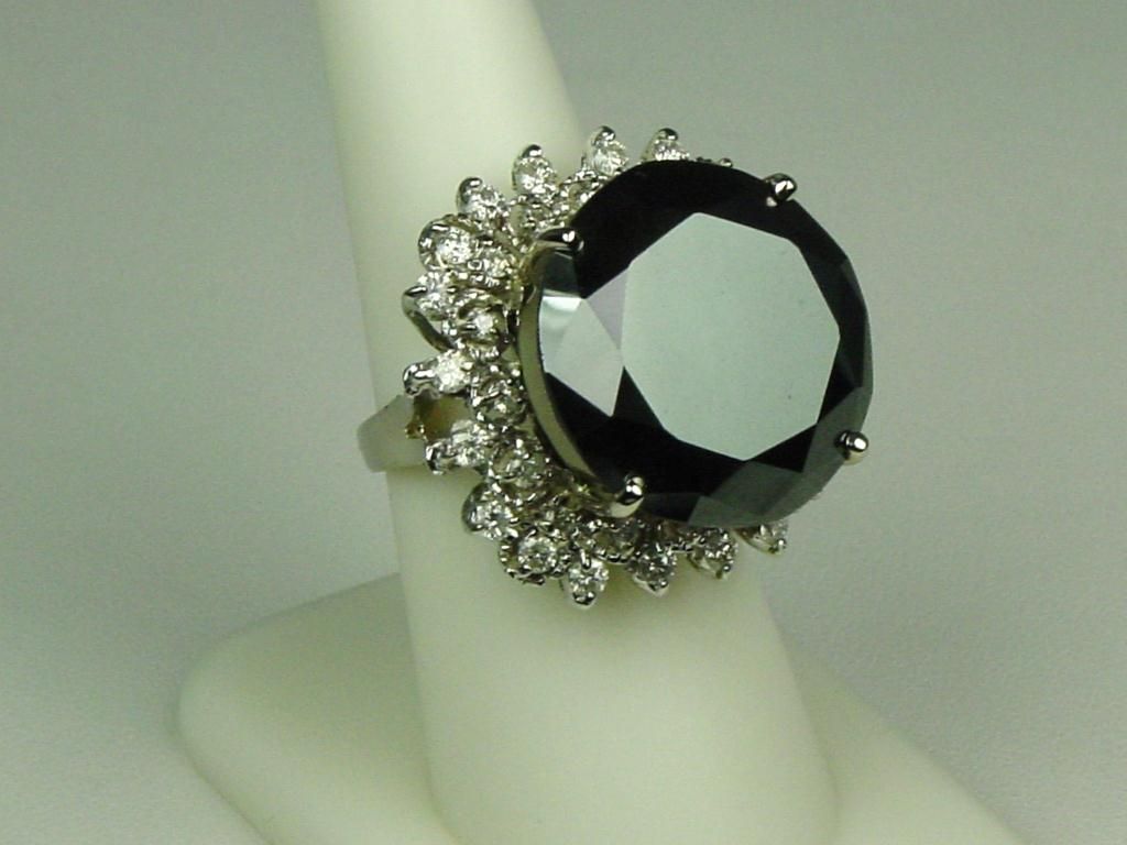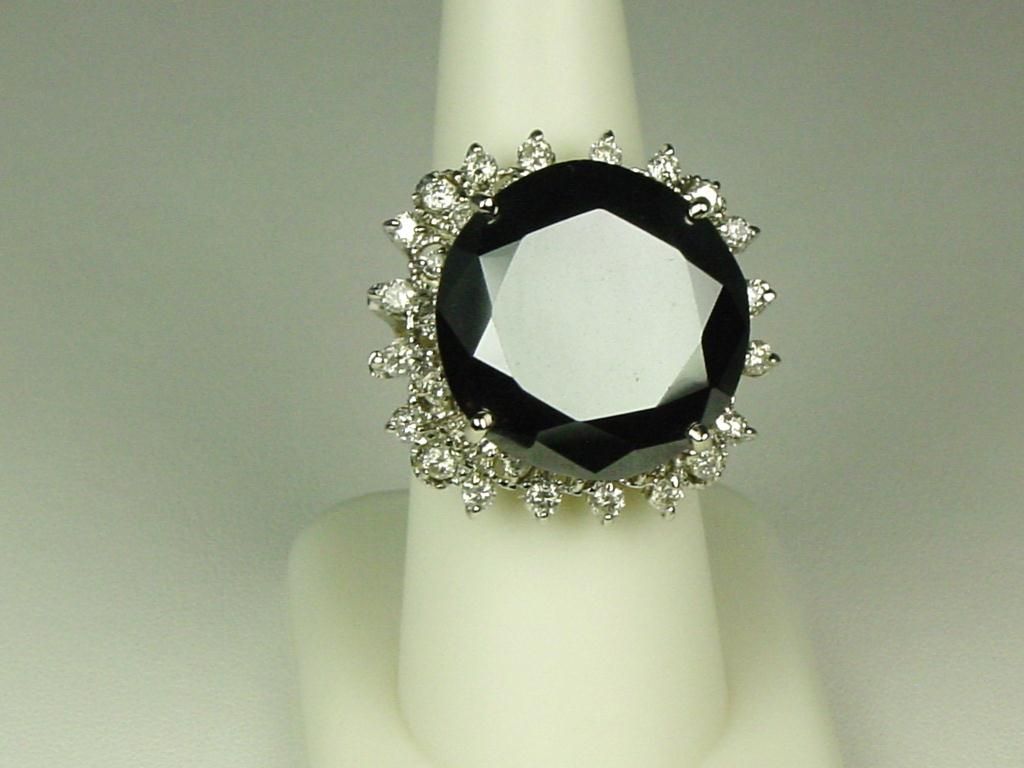 Exceptionally large 28.26 carats round ‘BLACK’ diamond set in a 14 karat white gold ladies ring surrounded by 38 round brilliant cut diamonds weighing approx. 1.44 carats of G-I colors and I clarity. Retail $22,295.00Estimate $6,000-$12,000 Please see FULL appraisal. Very rare stone of this size.