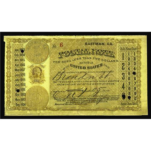 <B>Excessively Rare Eastman, Georgia Postal Note</B></I><BR>This attractive note bears low serial number 6 and was issued in September of 1883 in the amount of 5¢. It's not only one of the nicest Postal Notes we've seen in some time but represents the first Postal Note of any kind we've had to offer from the state of Georgia. <B>About Uncirculated.</B></I>