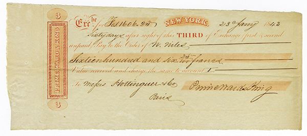 Exchange Check from the firm of Prime, Ward & King. The origin of the term "Prime Rate". Very Fine. Printed on 1838 dated watermarked paper. (From the collection of John E. Herzog)