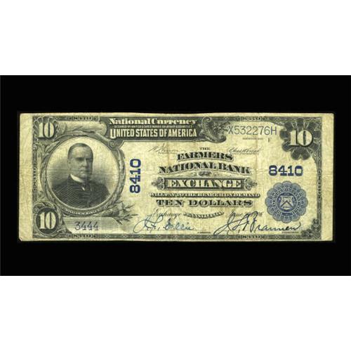 <B>Exchange, PA</B></I> - $10 1902 Plain Back Fr. 626 <B>The Farmers NB</B></I> Ch. # 8410<BR> This is a very scarce bank in large size, with the census documenting seven notes including this $10. <B>About Fine,</B></I> with sharp blue pen signatures of J.F. Ellis and J.L. Brannon.<BR><BR><b>Shipping:</b> Coins & Currency (<a target="_blank" href="http://www.heritageauctions.com/common/shipping.php">view shipping information</a>)