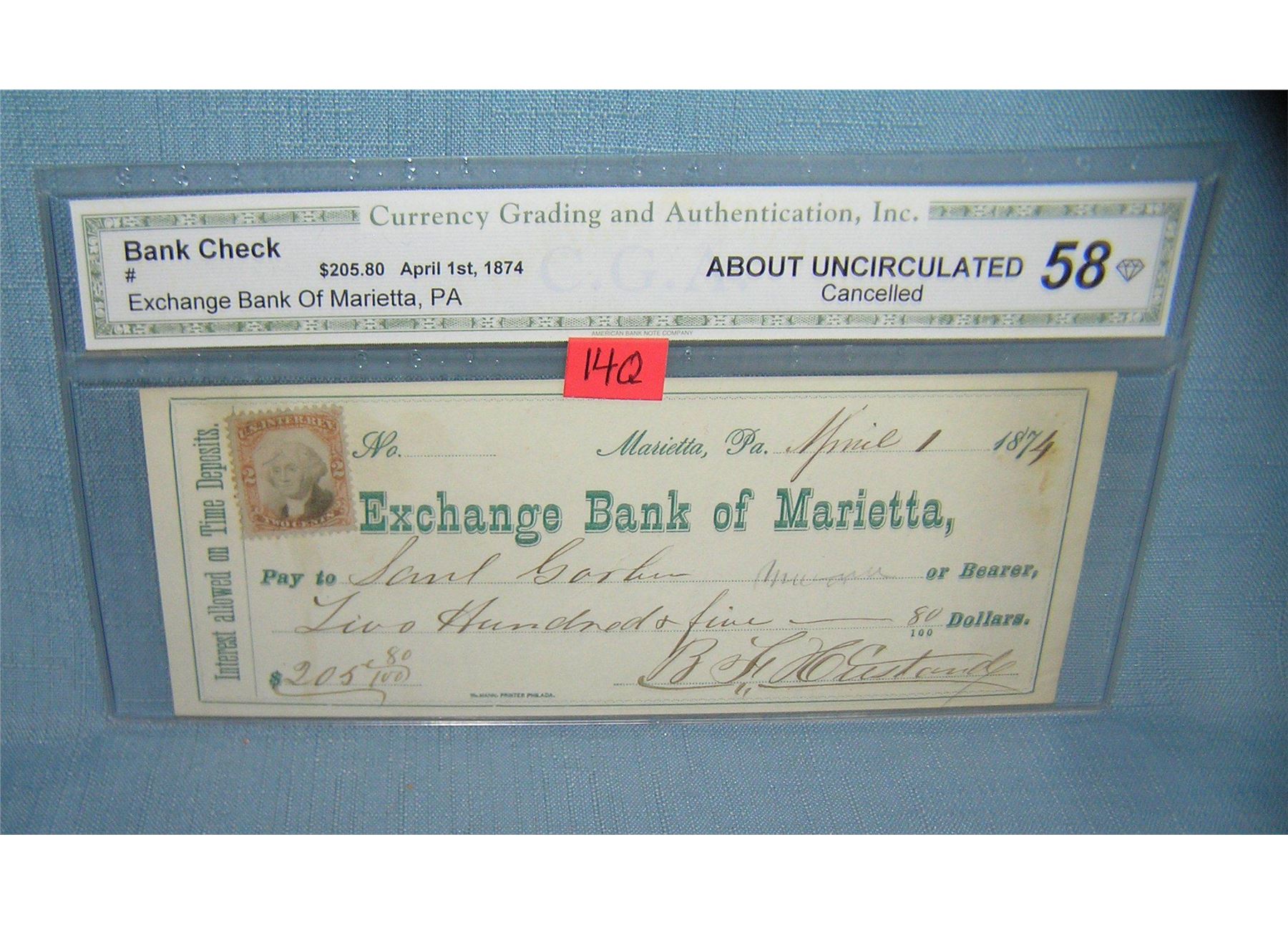 Exchange bank of Marietta PA bank check with period George Washington 2 cent stamp check dated April 1, 1874 graded about uncirculated est. value $65.00-$75.00