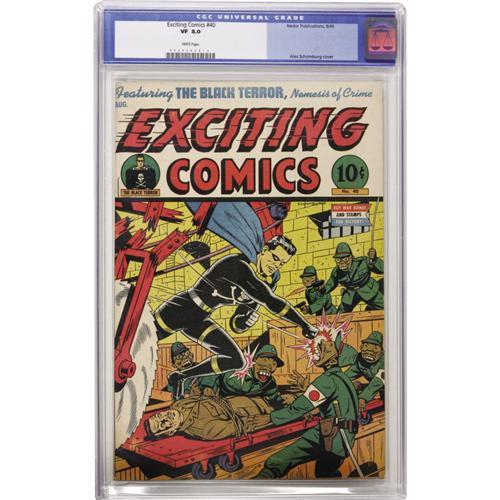 <B>Exciting Comics #40 (Nedor Publications, 1945) CGC VF 8.0 White pages.</B></I> Japanese war cover by Alex Schomburg. Overstreet 2006 VF 8.0 value = $356. CGC census 9/06: 1 in 8.0, 2 higher.<BR><BR><b>Shipping:</b> Slabbed Comic (<a target="_blank" href="http://www.heritageauctions.com/common/shipping.php">view shipping information</a>)