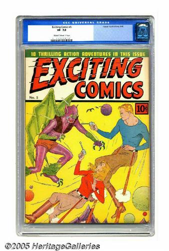 <B>Exciting Comics #5 (Nedor Publications, 1940) CGC VF- 7.5 Cream to off-white pages.</B></I> While we see the later issues of this title quite often, the first few issues are harder to come by. The lead feature here went to the Space Rovers, and the best-known character is probably the blind superhero known as the Mask. Gerber credits the cover art to pulp artist Max Plaisted. Overstreet 2005 VF 8.0 value = $481. CGC census 6/05: 1 in 7.5, 2 higher.