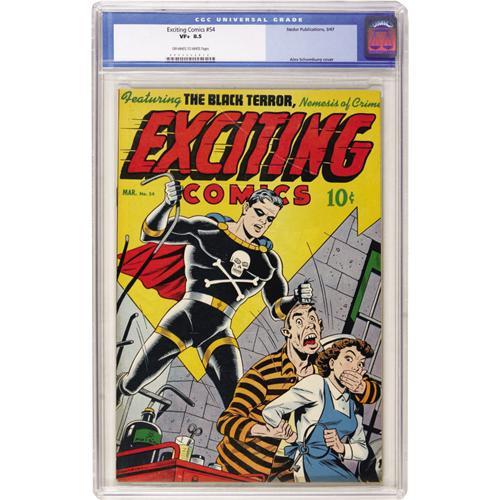 <B>Exciting Comics #54 (Nedor Publications, 1947) CGC VF+ 8.5 Off-white to white pages.</B></I> With a FN- 5.5 the only other copy on CGC's census as of this writing, this copy shapes up as the best available! The cover by Alex Schomburg features the Black Terror. Overstreet 2006 VF 8.0 value = $338; VF/NM 9.0 value = $532. CGC census 3/07: 1 in 8.5, none higher.<BR><BR><b>Shipping:</b> Comics - Slabbed (certified) (<a target=""_blank"" href=""http://www.heritageauctions.com/common/shipping.php"">view shipping information</a>)