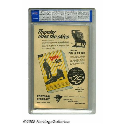 <B>Exciting Comics #55 (Nedor Publications, 1947) CGC VF/NM 9.0 White pages.</B></I> Judy of the Jungle begins in this issue, but the Alex Schomburg cover is the main attraction. Well, that, and the fact that this is one of only two copies of #55 that CGC has certified to date. Check out the page quality on this one. Overstreet 2005 VF/NM 9.0 value = $511; NM- 9.2 value = $685. CGC census 9/05: 2 in 9.0, none higher. <BR><BR><B>Important notice:</B> Heritage usually auctions material at the rate of 200-250 lots per hour. On some occasions eBay Live bid software or the Internet may not be able to keep up with the pace of the auction. We recommend placing a realistic absentee bid now as insurance to avoid disappointment. Occasionally the auctioneer may eliminate or reject an eBay Live bid, and the auctioneer may also reopen a lot after the close of the eBay live bidding (usually because we missed an audience bid), and may reject your bid even if it shows you as the winning bidder. By bidding via eBay Live, you agree that Heritage may award the lot to another bidder at its sole discretion under the circumstances described above or any other reasonable circumstances. Since eBay bids are not shown to us until we open the lot on the floor, we treat those bids just like floor bids. In most cases the floor responds before the eBay bid is presented to us, due to Internet lag time, so for consistency we have made it a policy that floor bids are always considered first over tie eBay live bids. Also please note that all Heritage lots purchased through eBay Live carry a 20% Buyer's Premium. Please make sure you read the Terms and Conditions before you bid. This lot is being auctioned in conjunction with a live floor auction by Heritage Galleries & Auctioneers. All final auction and invoice information will be supplied by Heritage Galleries & Auctioneers, and all other information should be considered preliminary. Lot:2343 <BR><BR><B>Winning Notification and Billing:</B> After th