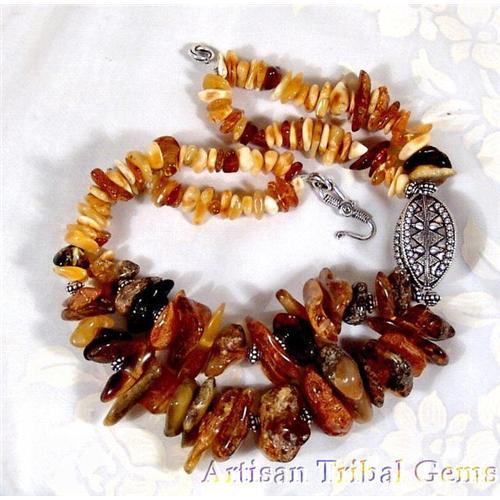 This choker is not a traditional Baltic amber necklace. Fashioned from chunky amber nuggets this is an extraordinary piece of artisan jewelry. The substantial AZTEC sterling silver beads measures 36x23mm for perspective to size. (25mm=1") The gram weight is an incredible 133 and Vera has finished this necklace to perfection with a bold 28mm sterling silver 's' hook not the traditional plastic screw closure. Classy and sure to draw attention for those that want the BEST. The necklace has a length of 15". A creation I am sure you would be proud to give or receive!