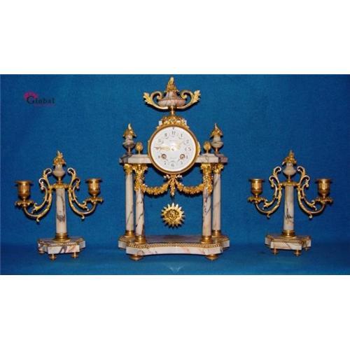 SIMPLY EXQUISITE!!!Take a moment and get a look at one of the most fabulous antique Empire clocksets we have had the pleasure to offer for auction in some time! This RARE, SPECTACULAR French clockset was made between 1870-1880(EMPIRE PERIOD).This eye catching marble with bronze gilt ornaments is just the thing to bring some high end designer style to your space!The dial is signed with" MERIMEE MANTES" and the clock work is stamped on the back " VCMB Mougin-Deux Medailles".Mougin was one of the most famous clockmakers in France at that time.This real beautiful museumpiece of an absolutely rare clockset is in complete original and excellent condition.Good running and striking condition with 8 days going French movement and the 1/1 and 1/2 hours striking on a silvered bell.The brass hands are really beautiful and are handmade.The dimensions are:Clock: Height:15,5 Inches, Width:10 Inches and Depth 5 Inches.Candle Sticks: Height: 9,5 Inches,Width: 8 Inches and Depth 3 Inches.This fantastic clock set came out a very fine estate in the South of France near Cannes.Regarding shipping we will pack the clockset in a wooden crate so you will receive it without any damage. Shippingscosts to the U.S.A. are 180 US$. After payment you will receive the clockset in about 5 days. This is a very nice clockset for the collector or someone wanting an unusual clockset that no one else has!!Thank you for looking this marvellous set.Sincerely,Wil Tegenbosch,Global Antiques Holland.