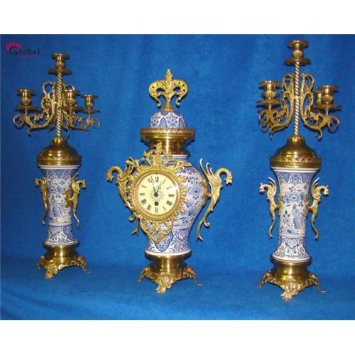 SIMPLY EXQUISITE!!!Take a moment and get a look at one of the most fabulous antique Clock Sets we have had the pleasure to offer for auction in some time! This RARE, SPECTACULAR French clock set was made between 1880 and 1900.This eye catching clock set with bronze and brass ornaments is just the thing to bring some high end designer style to your space!Elegant hand painted pottery,which is probably Delft pottery, with flowers and birds, gorgeous ornaments made of bronze and brass give it such a exclusive look!!The 8-days clock movement is in fine working order and has no chime so you can put this wonderful clock set in your bedroom too.Very fine white porcelain enamel dial with Roman numerals and fine steel hands.Original wind up key and pendulum are included.The complete clock set was cleaned by our restore-man and is in perfect condition.The dimensions are:Clock: Height: 21,5 Inches, Width:12 Inches and Depth: 7 Inches.Candelabras: Height: 24 Inches,Width: 7,5 Inches and Depth: 7,5 Inches.This fantastic clock set came out a very fine estate in the South of France near Marseille.Regarding shipping we will pack the clock set in a wooden box so you will receive it without any damage. Because the clock set is that big shippingscosts to the are 250 US$. After payment you will receive the clock set in about 5 days. This is a very nice clock set for the collector or someone wanting an unusual clock set that no one else has!!Thank you for looking this marvelous clock set.Sincerely,Wil ...