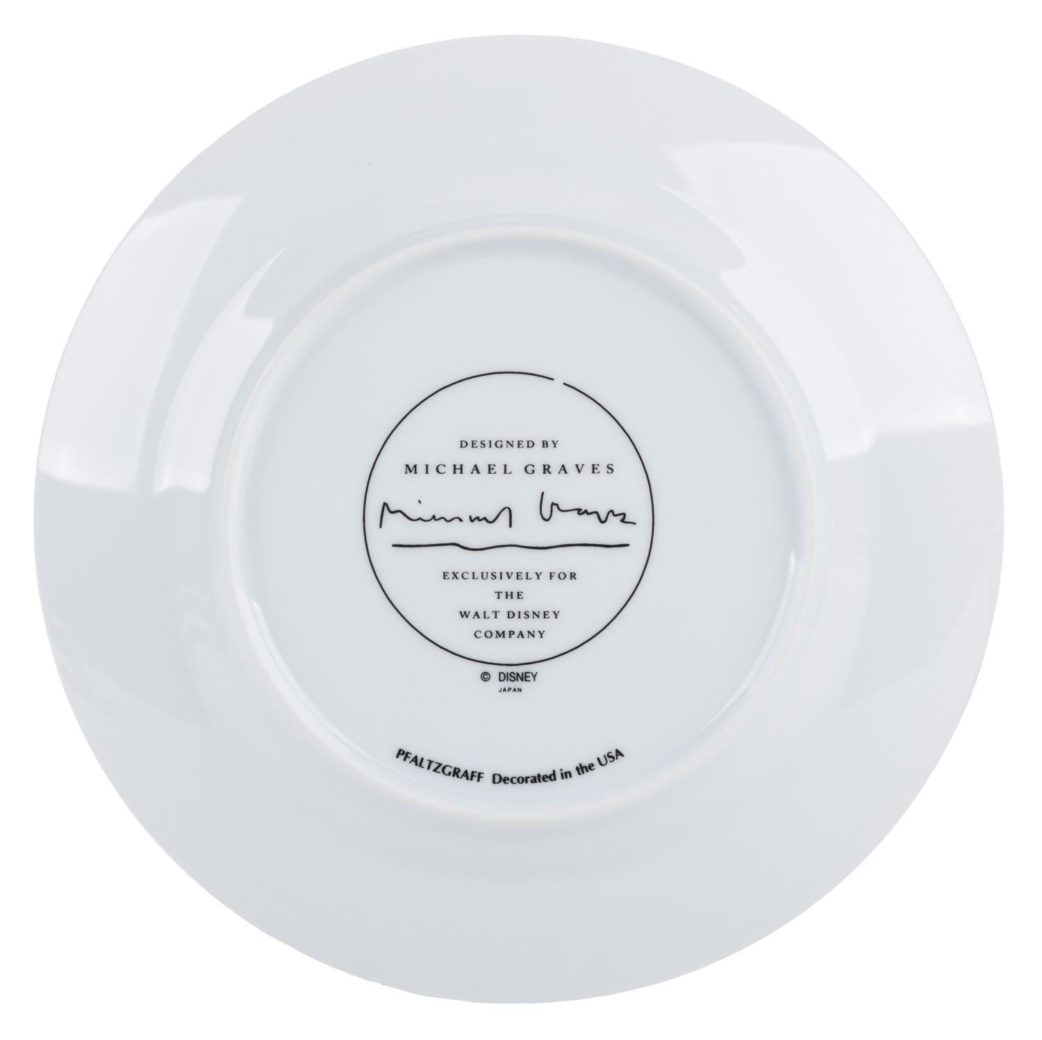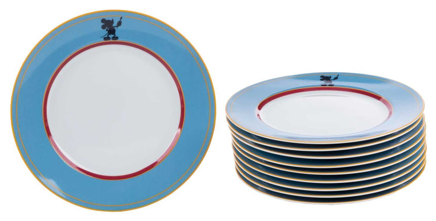 (Disney, 1990s) A set of 10 replica Disney Studio Executive Dining Room Salad Plates. Architect Michael Graves designed this pattern for the Walt Disney Studio's Team Disney Building in Burbank. This pattern was available for purchase at the short-lived Walt Disney Galleries store in Santa Ana during the 1990s. Measuring 7.75” in diameter, the plates are in very good to fine condition with light wear and chipping on one plate.