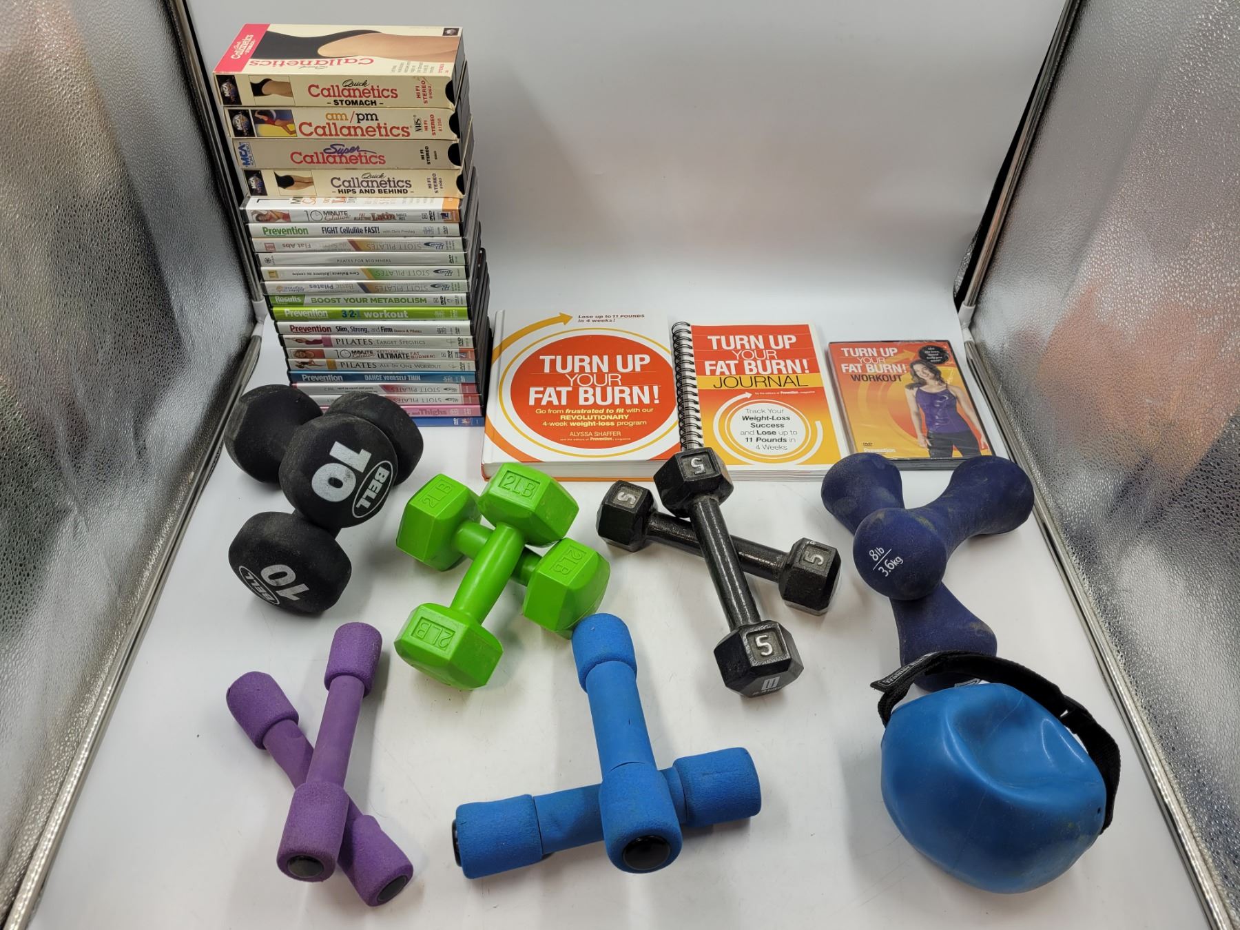 Includes weight loss books, weight loss DVDs, and dumbbells