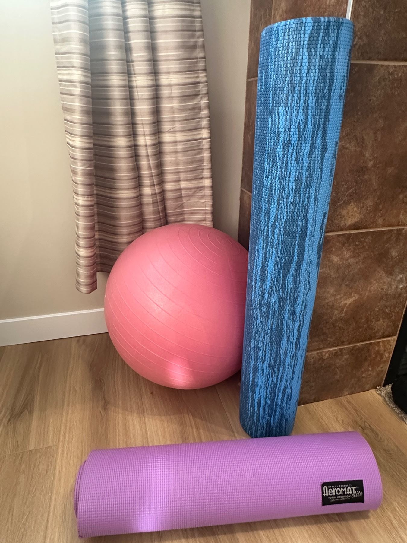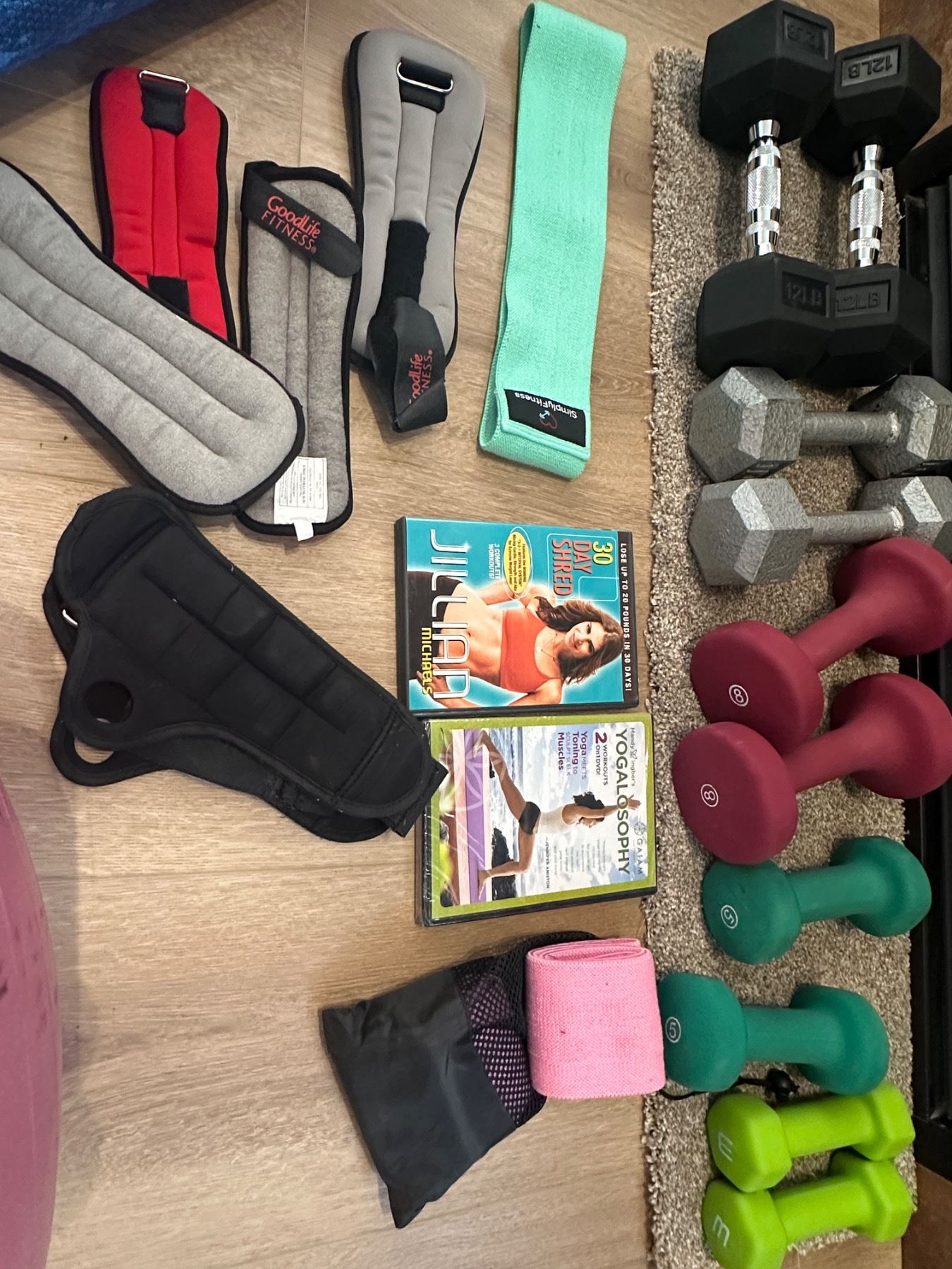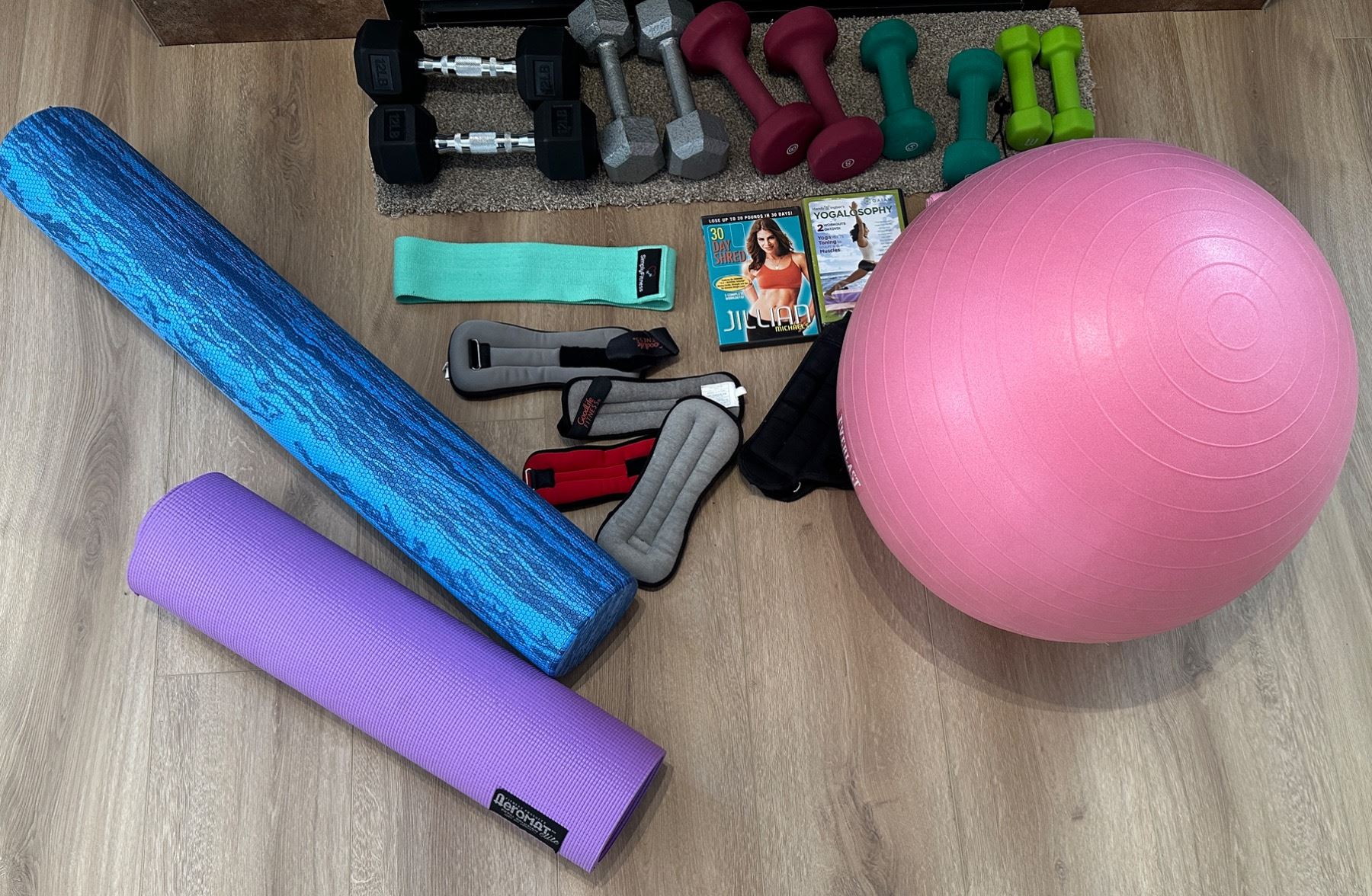 Includes 5lbs, 8lbs, 10lbs, 12lbs weights, yoga mat, foam roller, exercise ball, exercise dvds, etc