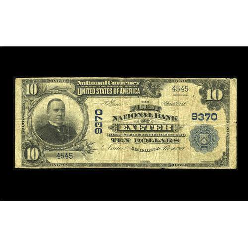 <B>Exeter, CA</B></I> - $10 1902 Plain Back Fr. 626 <B>The First NB</B></I> Ch. # 9370<BR>This note was part of the Lowell Horwedel Collection of California National Bank Notes where it was described, "A very rare one bank community in rural Tulare County. This bank issued large notes only, and, very typically for this state, while five notes are listed in the census only one has ever been available at public sale, with that coming when this example was obtained by Lowell in 2003. While well circulated and a touch soiled on the reverse, where can another note from here be acquired at any price?" <B>Very Good-Fine.</B></I>