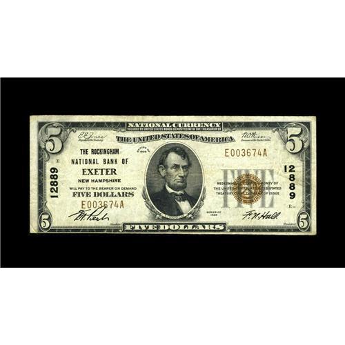 <B>Exeter, NH</B></I> - $5 1929 Ty. 1 <B>The Rockingham NB</B></I> Ch. # 12889<BR>This nice <B>Very Fine</B></I> is the highest serial known amongst the ten survivors of this type and denomination documented from here. Nicholas Gilman, a delegate to the Continental Congress, signer of Colonial Notes from this state and one of its United States Senators from 1805-1814, rests here in Exeter Cemetery. An attractive overall representative of this community and bank from the only one of the two chartered institutions located here to survive long enough to issue the 1929 series.
