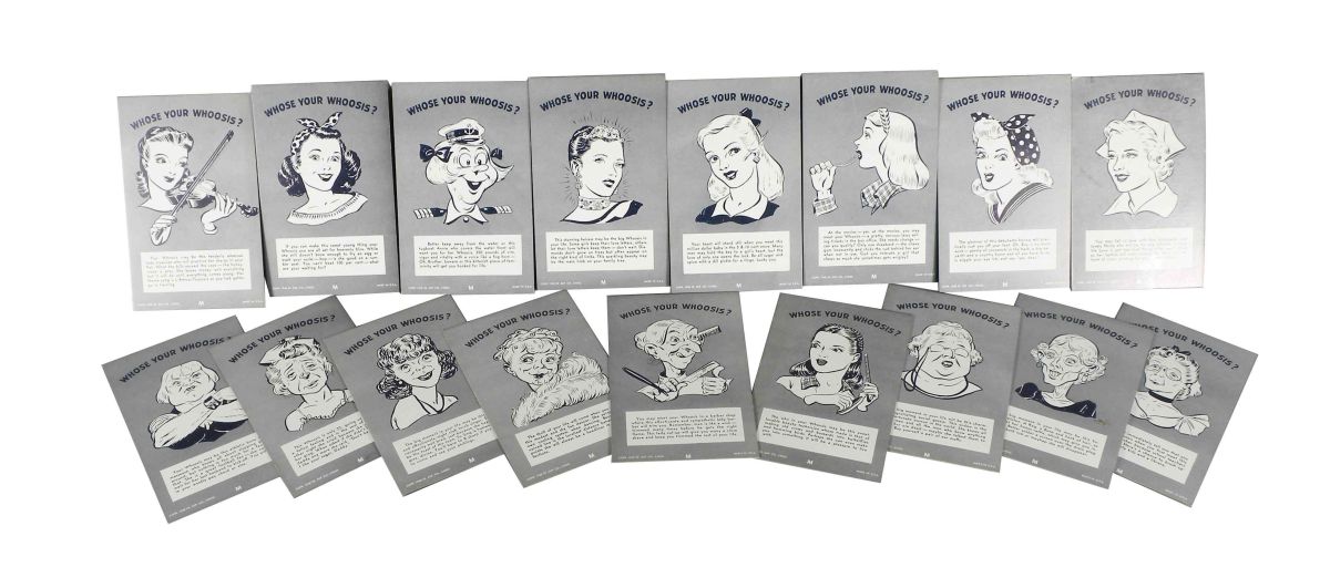 Exhibit Supply Company Chicago, 1946, 17 of "Whose your Whoosis" arcade cards. Cards unused, 3 1/4 X 5 1/2 inches.
