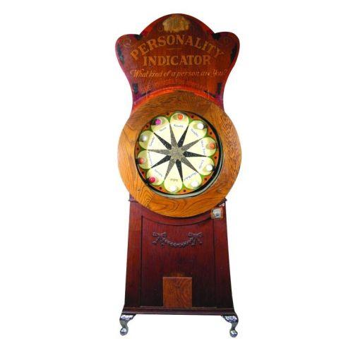 Exhibit Supply Co. Personality Indicator. Made in Chicago, IL. Coin Operated, Nickel. Price has been rubbed off of top of machine, otherwise good condition. 29 x 79 x 20 inches.