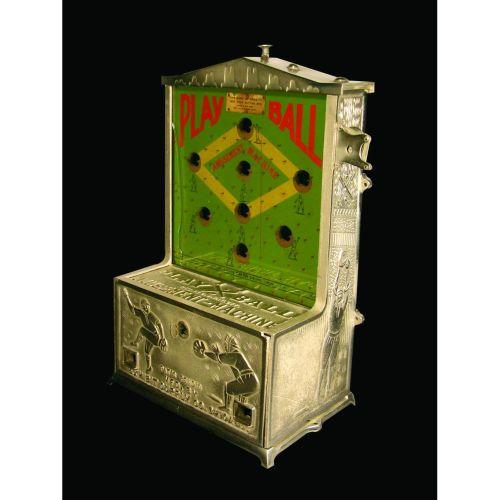 Exhibit Supply Co. Play Ball Amusement Machine. Trade Stimulator. Made in Chicago, IL. This little beauty has 4 side brackets that either held a cast iron back on or were used to attach the machine to a wall. Excellent Working Condition. 14 x 19 x 8 inches.