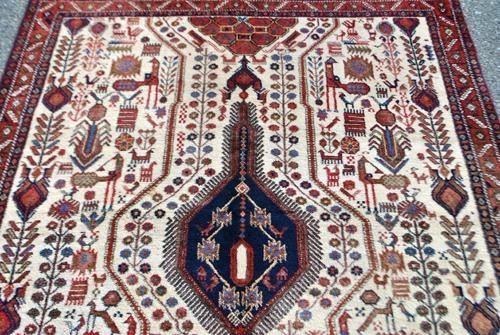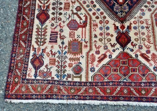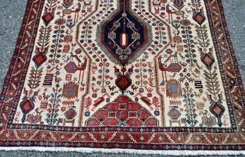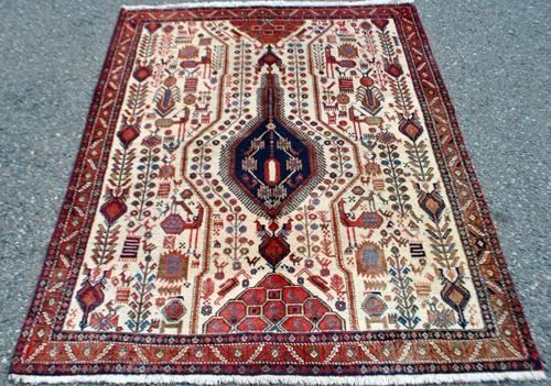 This is a decorative (exhibit) size of an abadeh hand woven Rug. Originally, carpets from abadeh had patterns of vases and rather insignificant colors but this one has a unique design and shows that its weavers were inspired by the qashqai nomads who had their summer pastures in the area. the carpets have a red-brown nuance combined with blue and with medallions in the middle and corners. Made of lamb wool on cotton foundation all naturally dyed. abadeh rug are known for their good utility carpets since they are very firm, hardy and durable. Right between shiraz and Isfahan lies the city of abadeh. To a visitor it does not offer much but, utility carpets of good quality are manufactured in this city. Size: 4 feet 7 inches X 5 feet 6 inches. Country of origin: Iran.
