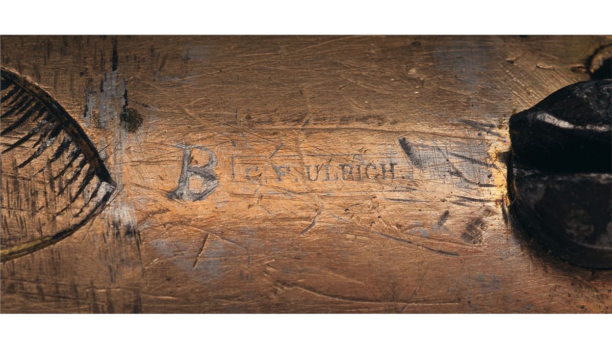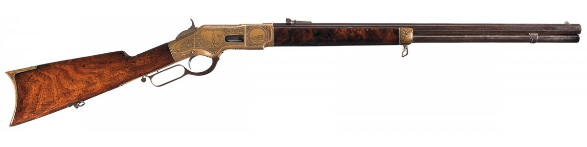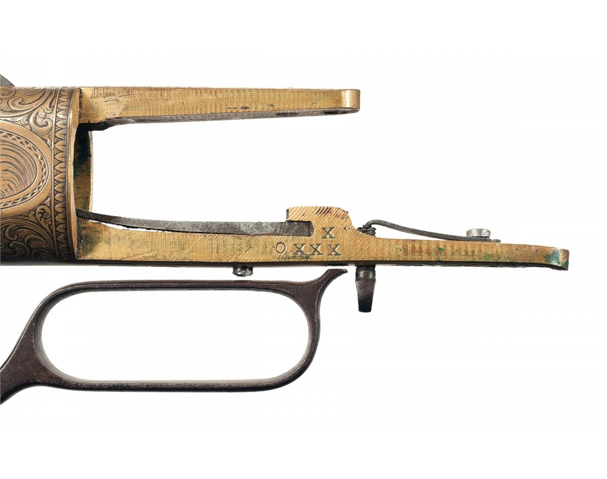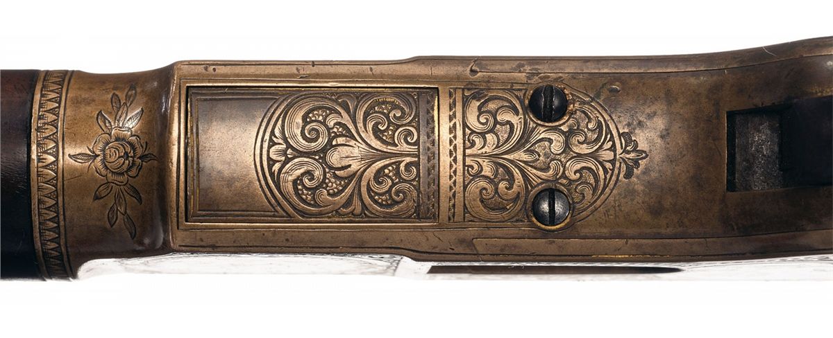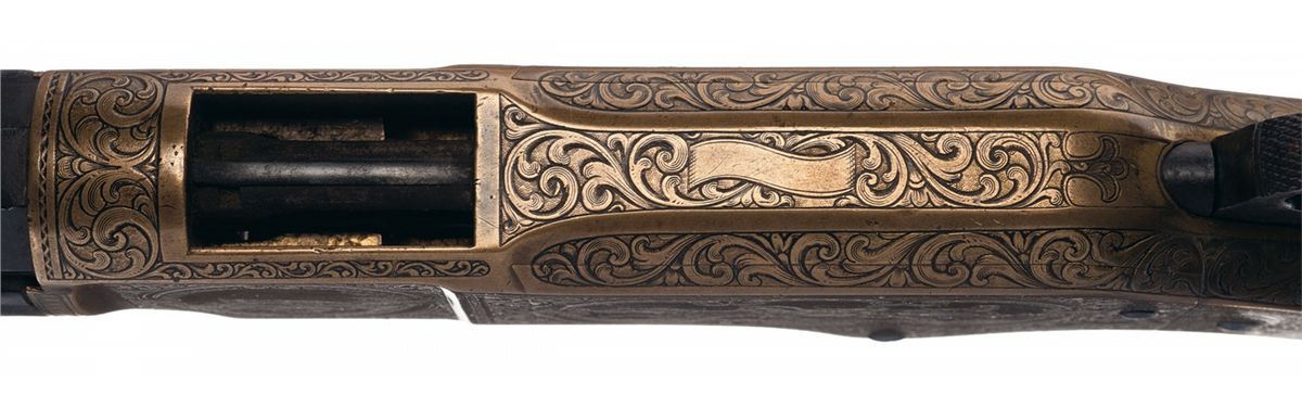 Condition: Very good plus.The rifle retains traces of the original blue and gold-plated finish in protected areas. The balance of the barrel and receiver have a dark plum-brown patina. The barrel has a some edge wear. The rear sight is original to the rifle but is slightly bent and will not fold. The case colors on the hammer and lever have aged to a deep brown patina. The forearm cap, receiver and buttplate have a very attractive patina and retain a significant amount of the gold-plated finish. The flawlessly executed scrollwork and unique and very detailed receiver scenes are deep and sharp. There are several minor scratches on the sulky scene. The re-oiled fancy grain stock and forearm are both very good overall with some scattered minor handling and storage marks. The barrel legend is crisp. This is a spectacular example of a rare and well documented, Conrad Ulrich engraved, Winchester Model 1866 rifle. The unique panel scenes engraved on the receiver make this truly a unique Winchester Model 1866 rifle.