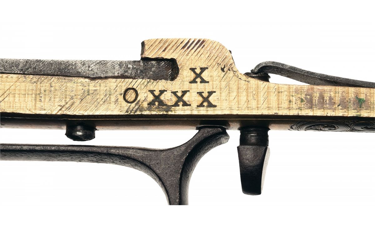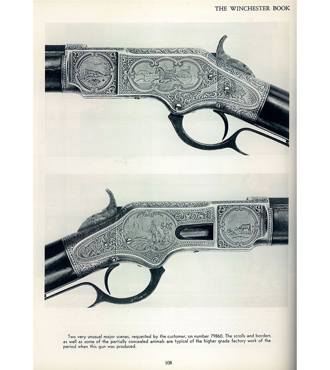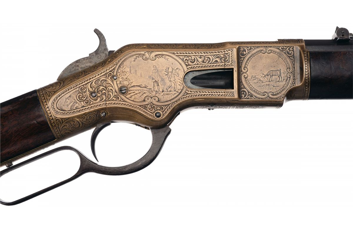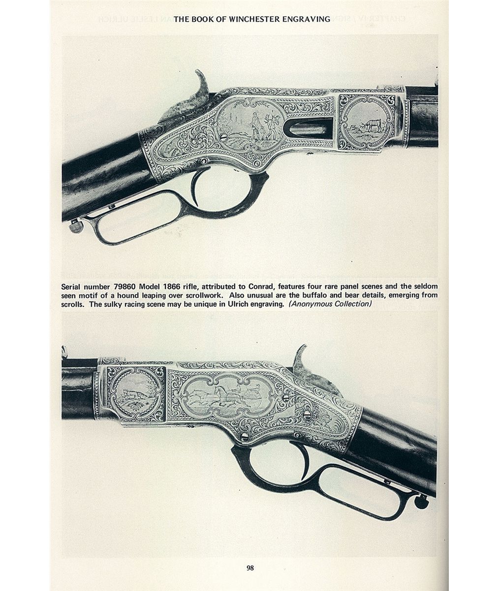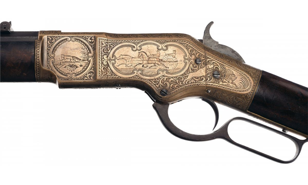 This is a rare and desirable example of a deluxe, factory panel scene engraved, Winchester Model 1866 rifle that was manufactured in 1870. This Third Model 1866 rifle has the distinctive receiver profile and serial number stamped on the lower tang. The full octagon barrel has a dovetail mounted front sight with nickel-silver blade and Henry style folding leaf rear sight. The magazine has a threaded cap. The brass forearm cap is secured by a screw drilled through the lower part of the barrel and is fitted with a factory sling swivel. The crescent brass buttplate has a trap that contains a four-piece jointed steel cleaning rod with brass tip. The stock has a factory sling swivel. The top barrel flat is roll-stamped with the second style legend "WINCHESTER'S-REPEATING ARMS. NEW HAVEN. CT. KING'S-IMPROVEMENT-PATENTED-MARCH 29. 1866. OCTOBER 16. 1860" in two lines ahead of the rear sight. The serial number "79860" is stamped on the lower tang behind the trigger and surrounded by an engraved banner the barrel and magazine are blued, the hammer and lever are color casehardened and the brass forearm cap, receiver and buttplate are gold plated. The stock and forearm are highly figured, fancy grade walnut. The forearm cap, receiver and buttplate are factory engraved with semi-relief Germanic scrollwork on a punch-dot background that includes a partially concealed hound, buffalo and grizzly bear. The sides of the receiver are engraved with highly detailed and unique customer requested scenes. The engraving is attributed to Conrad F. Ulrich by R.L. Wilson in "THE BOOK OF WINCHESTER ENGRAVING". The left side plate is engraved with a sulky racing scene; Wilson describes the sulky scene as "unique in Ulrich engraving". The forward portion of the receiver is engraved with a hunting fox in an oval panel. The right side plate is engraved with a hunting scene which depicts two hunters field-dressing a moose. A deer and a hound are engraved in an oval panel on the forward portion of the receiver. The remainder of the receiver; including the cartridge elevator and lower tang are decorated with detailed scrollwork. The receiver engraving is illustrated and described on page 98 of "THE BOOK OF WINCHESTER ENGRAVING" and on page 108 of "THE WINCHESTER BOOK" by George Madis.